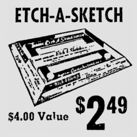 This 1964 newspaper ad for Ohio Art’s Etch-A-Sketch* comes from early in the toy’s life and shows us that even then, the new toys were often on sale for the Christmas holiday. I’ve never been at all skilled with the Etch-A-Sketch, but the history outlined in Timeless Toys* has made me a fan of the history of the toy.