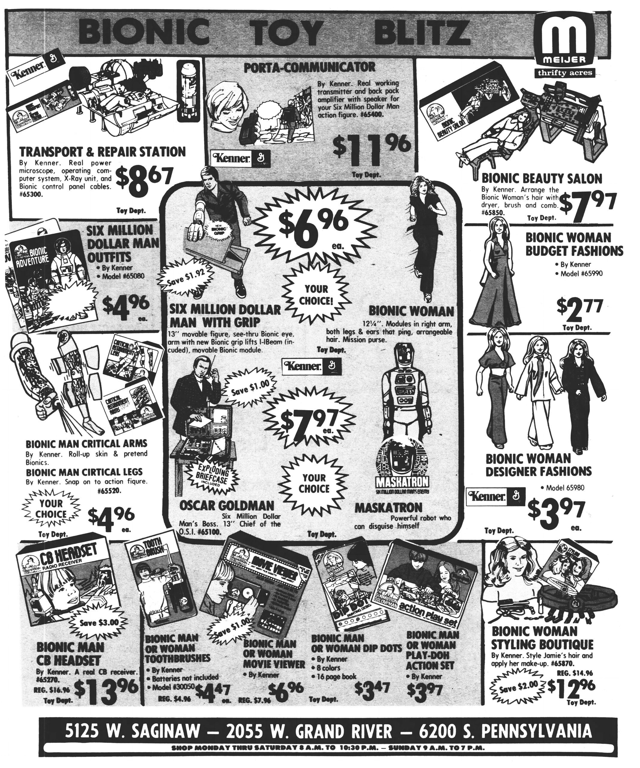 October 2, 1977. Fans of Kenner’s Six Million Dollar Man action figures get a special treat today: This full-page Meijer advertisement for the action figures, accessory sets, and various other Bionic Man and Bionic Woman toys of the seventies! I’ve shared other ads for many of these toys before, but none of them can compare to this Lansing State Journal ad that is almost as jam-packed as the Kenner catalog!