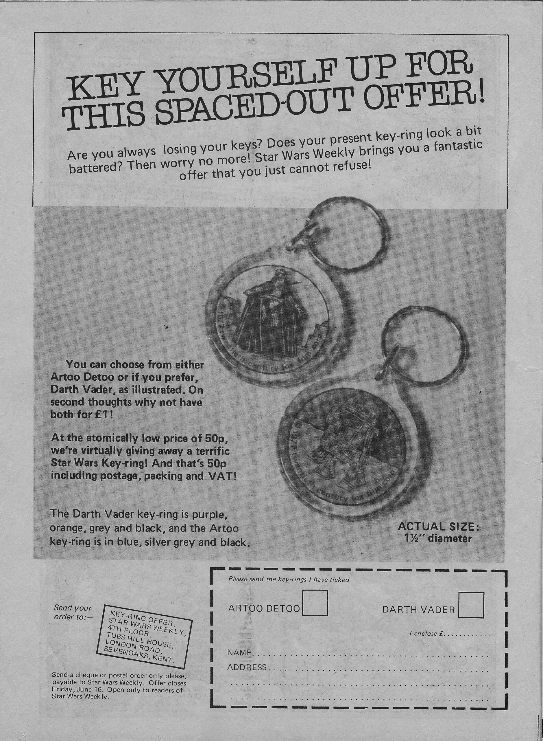 Out of issue #16 of the UK Star Wars Weekly comic book — which was then reprinting the Marvel series — comes this advertisement for Star Wars key rings, just one of a flood of inexpensive Star Wars merchandise that was dumped on the world in 1977 and 1978. I haven’t seen these myself, but I suspect that they’re pretty cheap.