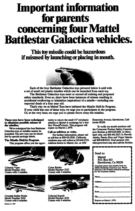 If you’re unfamiliar with the situation, check out the 1979 newspaper article that we uncovered a few years ago. The short form: A child accidentally died when he choked on a Mattel Battlestar Galactica toy missile, so the company issued the following missile exchange program and warning. It’s sad that this happened, and we can point directly at this incident for why so many of our memories of missile-firing toys don’t include “and that Boba Fett backpack missile was so fun!”