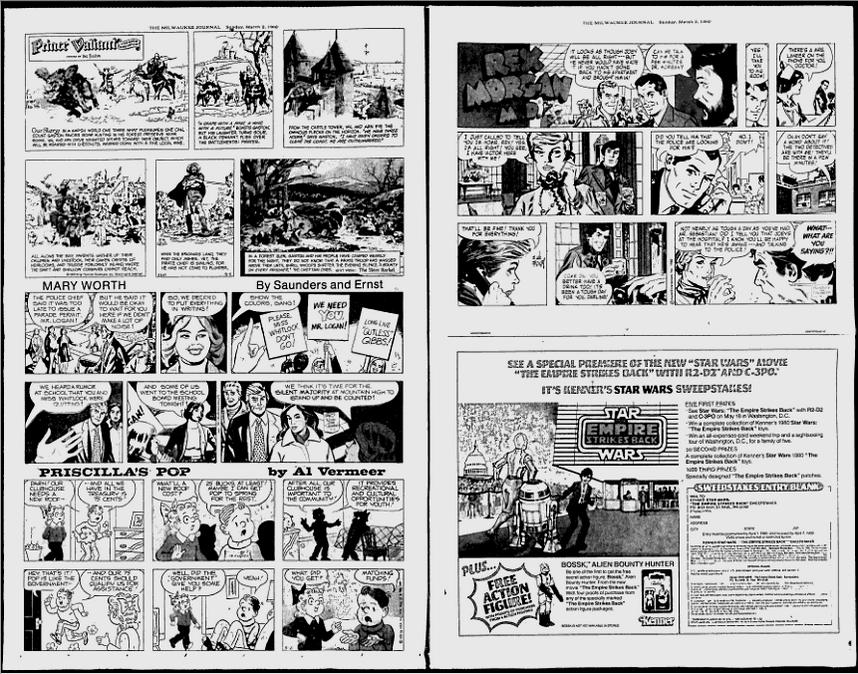 Out of this March 2, 1980, Milwaukee Journal newspaper comes a half-page advertisement for a chance to see The Empire Strikes Back at a special premiere event. Five kids were offered the chance to win the trip, but it’s the 50 second place winners who I believe were the real winners: They were each given a complete set of the 1980 Kenner Empire Strikes Back toys! That’s incredible! Did any of you enter this sweepstakes?