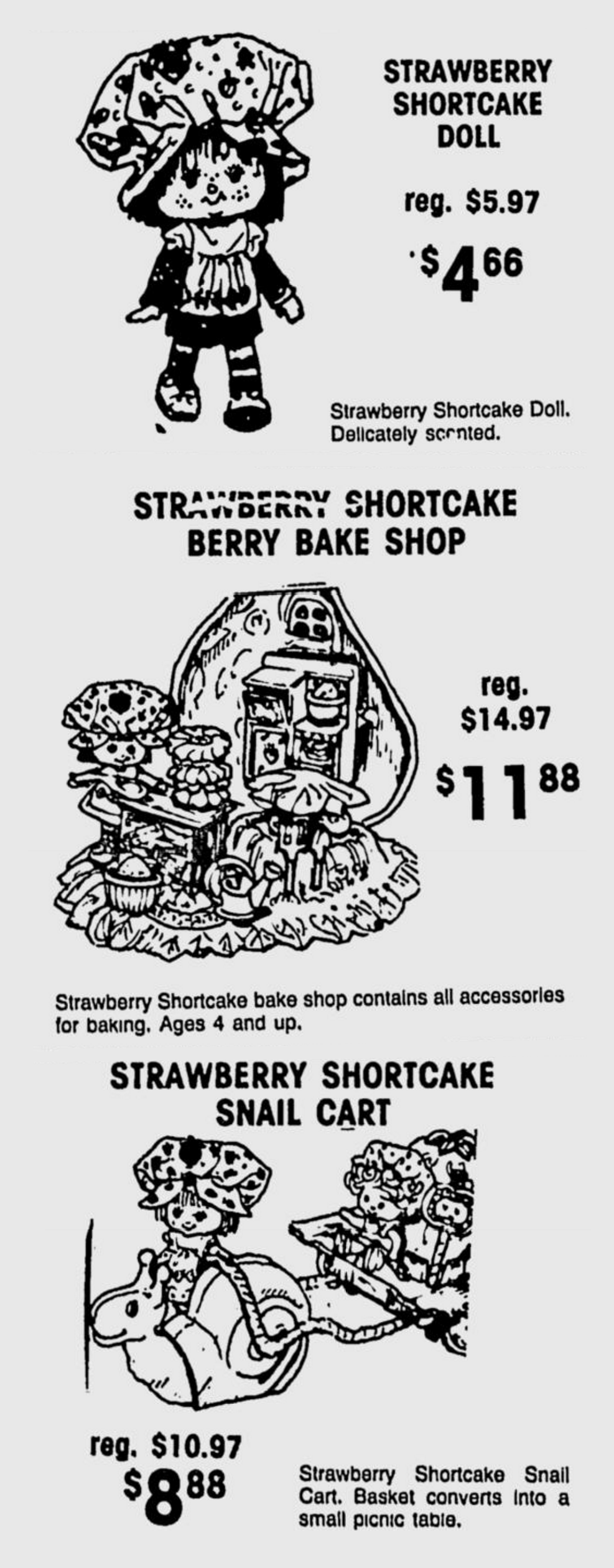 If you look closely at the complete advertisement you’ll notice that Milton Bradley’s Starbird Avenger makes an appearance on the page. We’ve already seen this form of Starbird Avenger ad, though, so I’ll instead direct your attention to the Strawberry Shortcake toys offered for sale. This was early in Kenner’s Strawberry Shortcake line, and looking at the toys listed I’ll again state: Strawberry Shortcake was clearly an action figure line designed for girls in the eighties. These toys are so sweet!