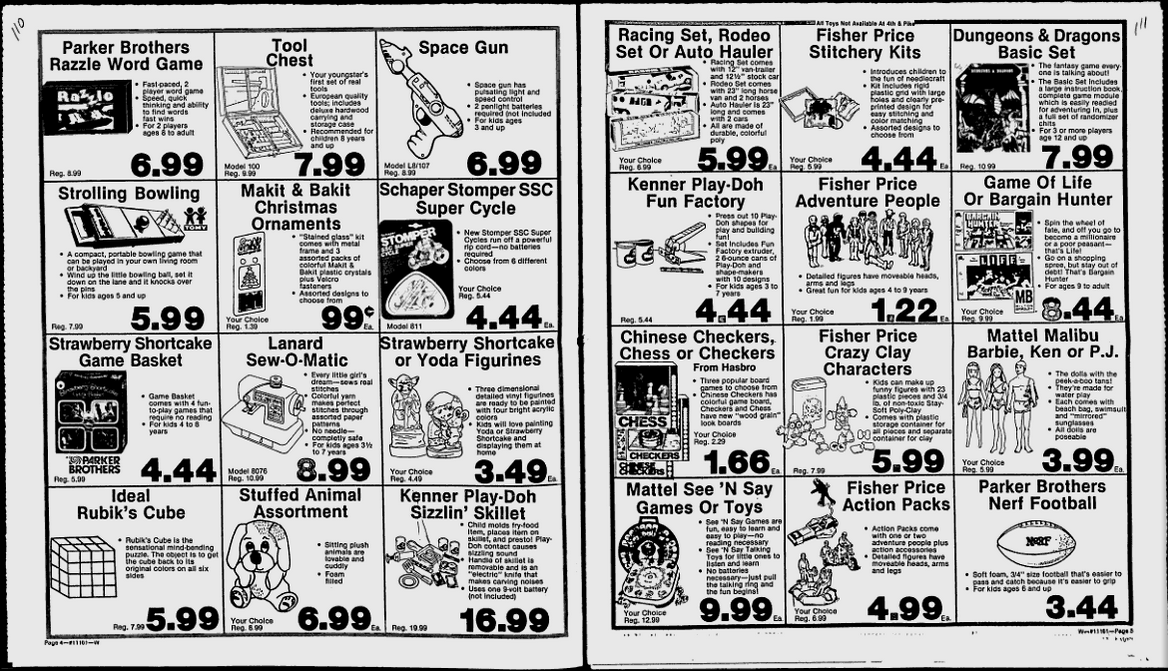 Here’s a fantastic combination of ads to start your day. From The Spokane Daily Chronicle newspaper in 1981 comes these brilliant and fun ads for the Dungeons & Dragons game and those delightful Fisher-Price Adventure People action figures. On sale for $1.22/each? Wow, I hadn’t realized the Adventure People action figures were so very cheap back in the early eighties.