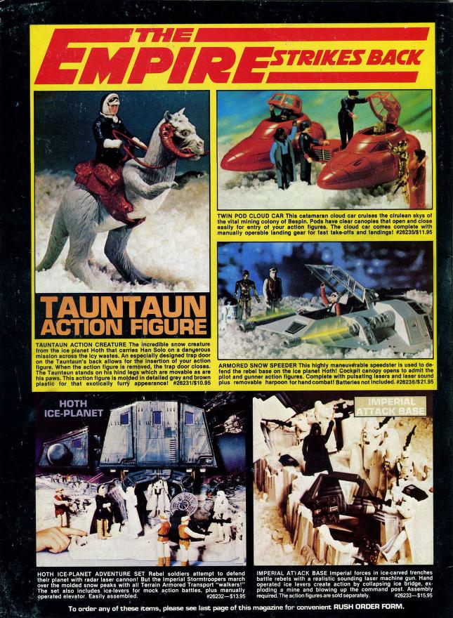 There are so many fantastic archives out there that it’s easy to overlook some fantastic things. For example, the back cover of The Goblin from Warren Publishing features this color advertisement for Kenner’s Empire Strikes Back toys. Seriously, the Tauntaun was only a dollar less than the Cloud Car? That seems off to me.