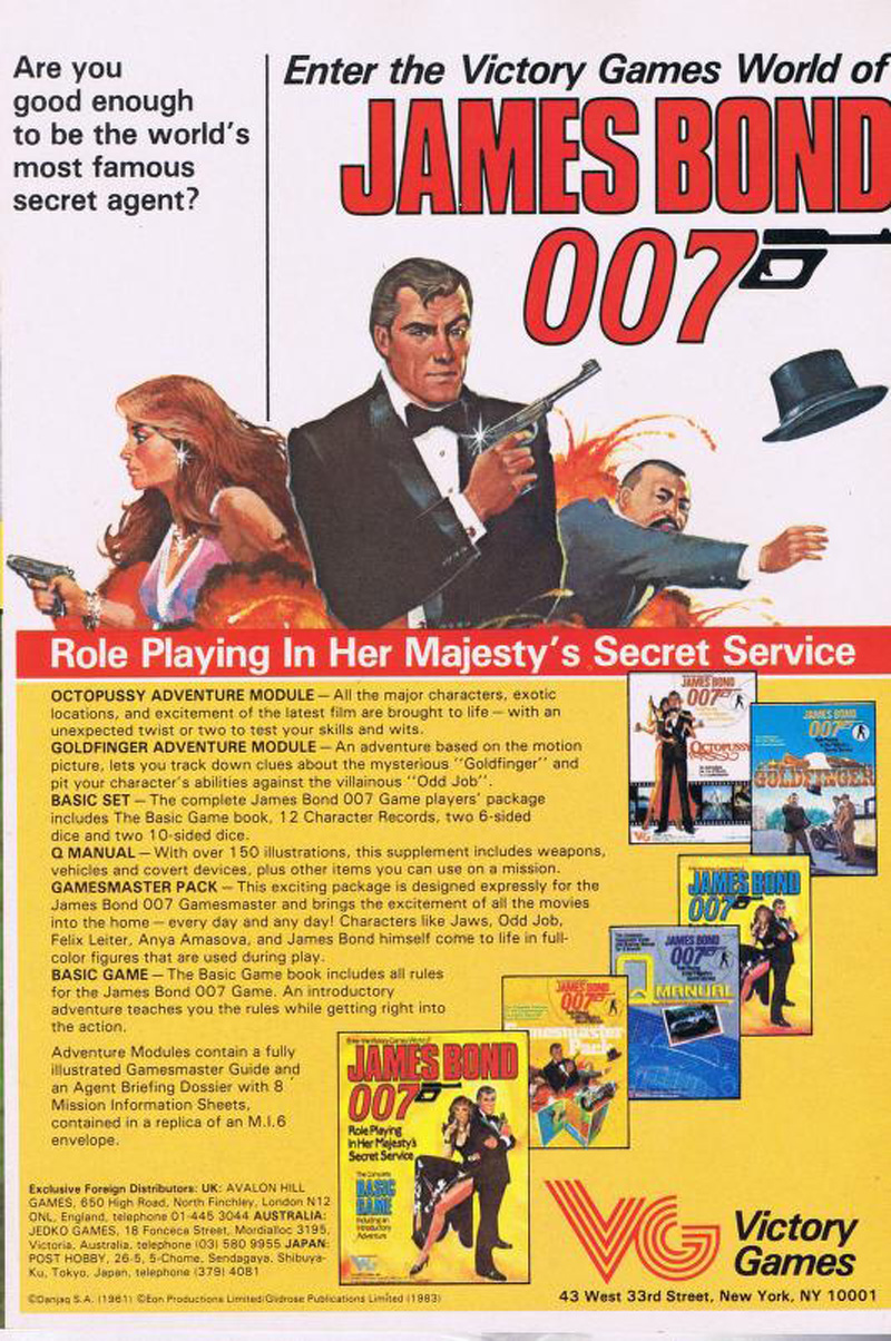 Inside the front cover of the February, 1984 issue of Starlog Magazine we find this ad for the classic James Bond roleplaying game from Victory Games (Amazon.com search*). I remember playing this game — once — but what I remember most is how very well-crafted the supplements were. I played a hell of a lot more Top Secret (Amazon.com search*), but that doesn’t make this ad any less fun to look at today.