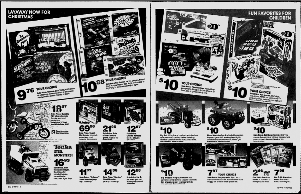 Part of my time at the office has been spent on the new Car Wars game (find at Amazon.com*), and work on that game got my brain spinning and sent me off again in search of the Tonka Steel Monsters toys. I still don’t own any of these toys, but if I could find the toys for even twice the prices shown in this 1986 newspaper ad you can believe I would own them all.