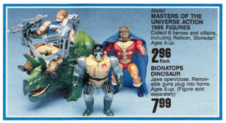 There’s a 1987 TRU ad posted at archive.org that deserves our attention. There are a handful of toylines represented in the ad, but I’d like to zero in on Mattel’s Masters of the Universe action figures as shown in the below ad block. The image only shows three figures, but it makes mention of Rokkon and Stonedar, two of the stranger figures from a time when Mattel was trying to adjust the brand to stay relevant with the interests of kids.