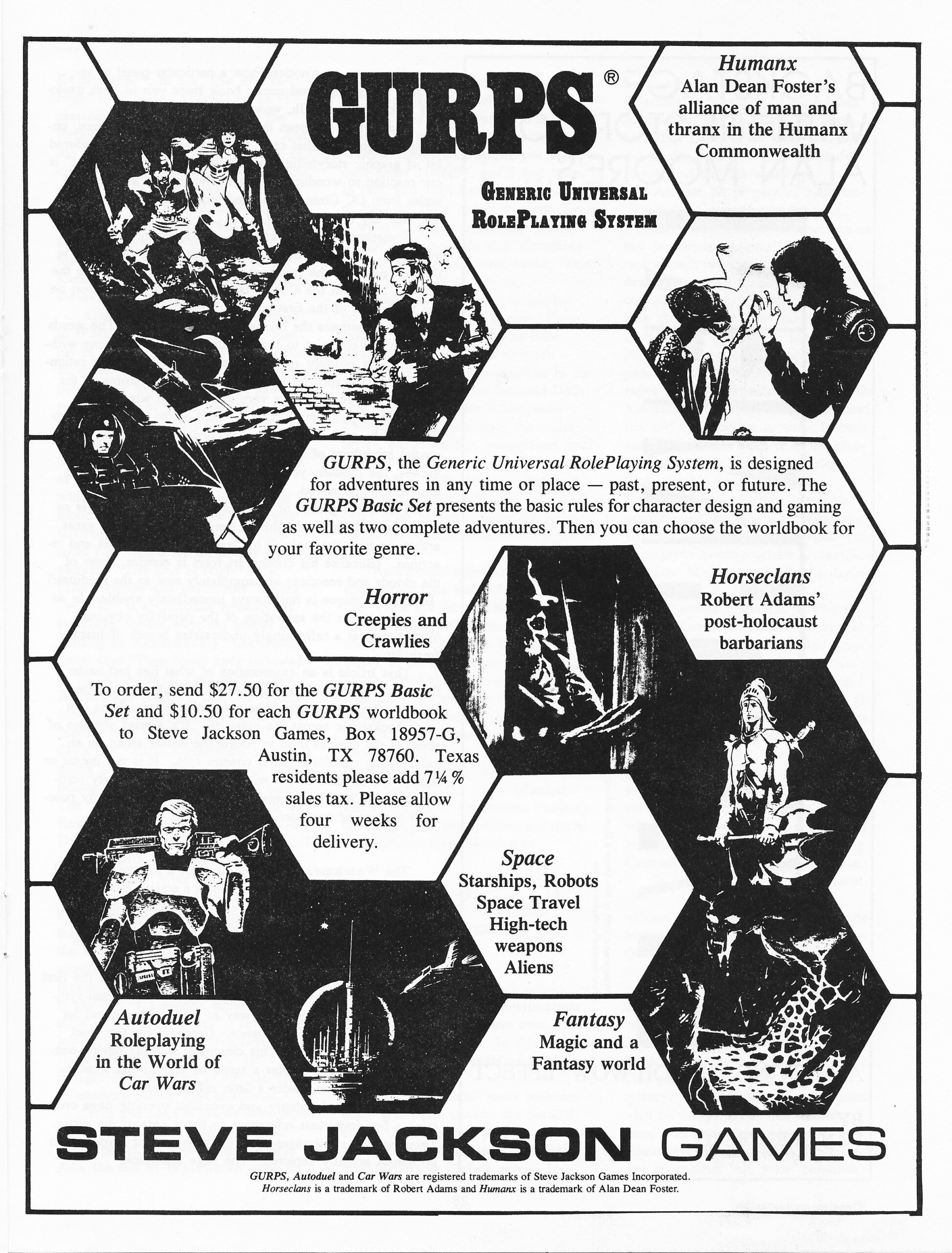 Today, though, I want to go back to the early days of GURPS and share this 1988 advertisement from Gateways magazine. The ad follows the graphic design seen in the earliest GURPS releases and features just some of the sourcebooks that were created back then. As you can tell, those early days of GURPS were packed with a wide variety of settings and sourcebooks. A fun ad that should bring back memories for those of you who, like me, were gaming in the late eighties.