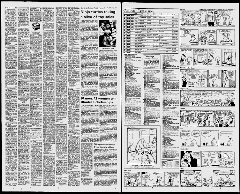 Out of the December 12, 1988 Lawrence Journal-World newspaper comes this associated press article on the creation of the Teenage Mutant Ninja Turtles series (Amazon.com search*). It’s kinda fluffy in presentation, but the simple fact the Teenage Mutant Ninja Turtles found their way into an article at all shows just how the brand was growing back in the late eighties.