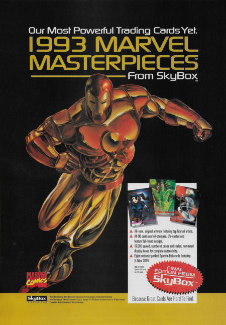 The 1993 Marvel Masterpieces trading cards by SkyBox (find at Amazon.com*) is a set from a different time, and this advertisement from Hero Illustrated shows what was considered to be some of the best superhero painted art of the early nineties. At the time, the artwork in these types of card sets always looked impressive, but now I can see that it was really just wonky superhero comic art with layers of paint to distract me from the strange anatomy.