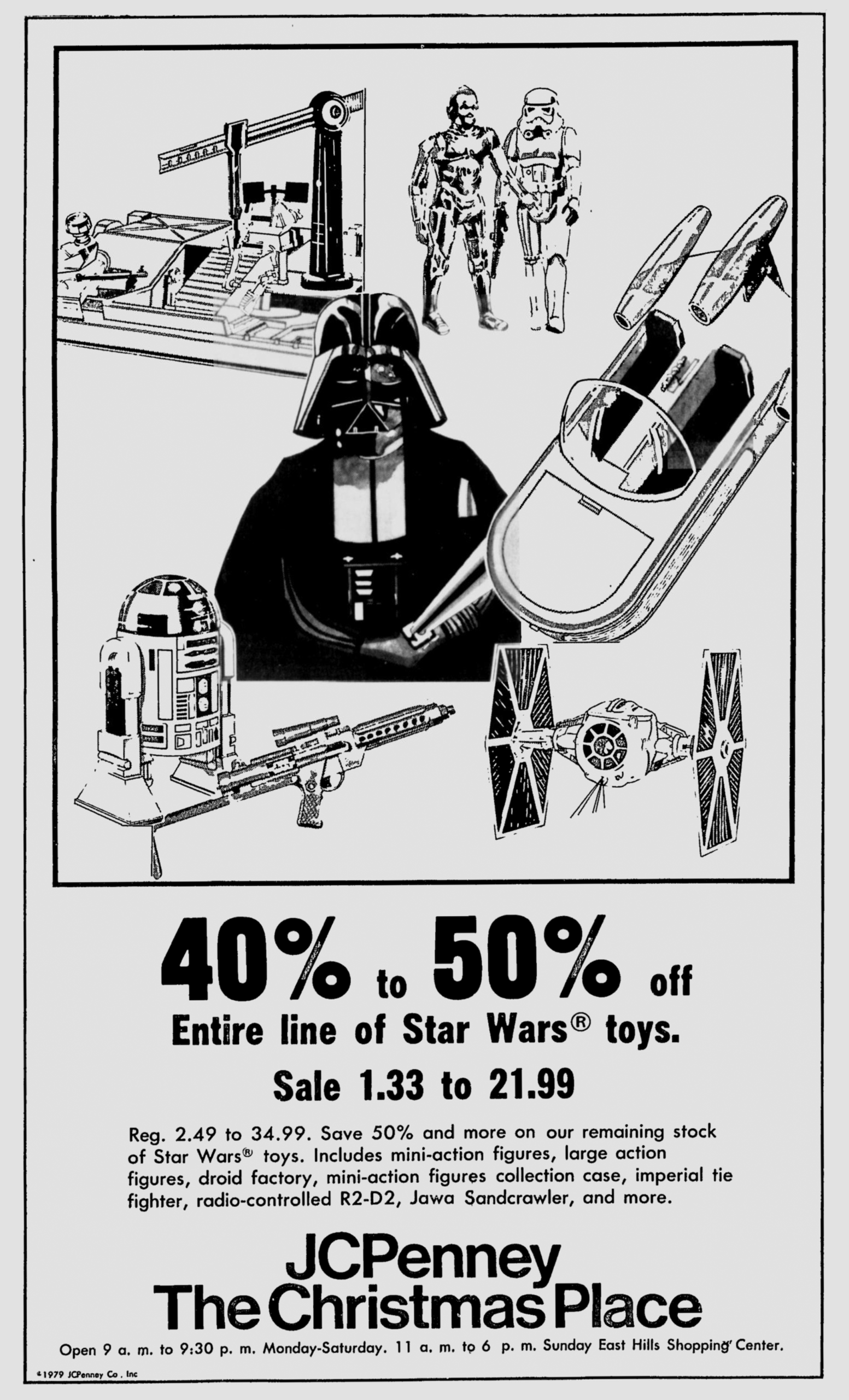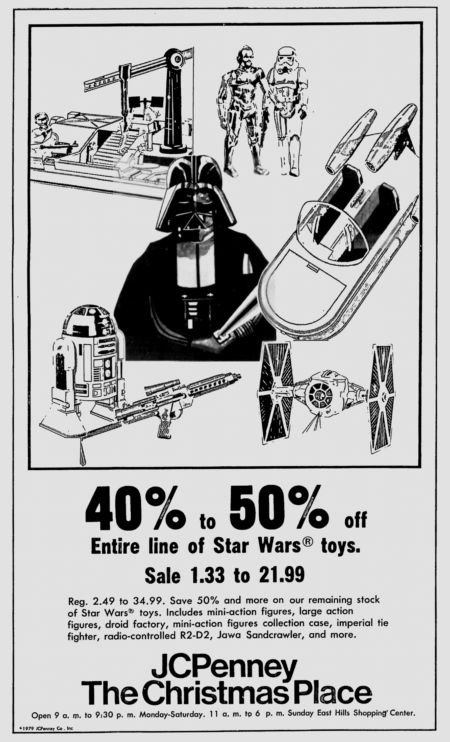 December 19, 1979. I’m now left asking: Why was JCPenny offering such a deep discount on Star Wars toys in 1979? Wouldn’t this have been a year when kids all across the U.S. wanted Kenner’s Star Wars action figures and vehicles for Christmas?