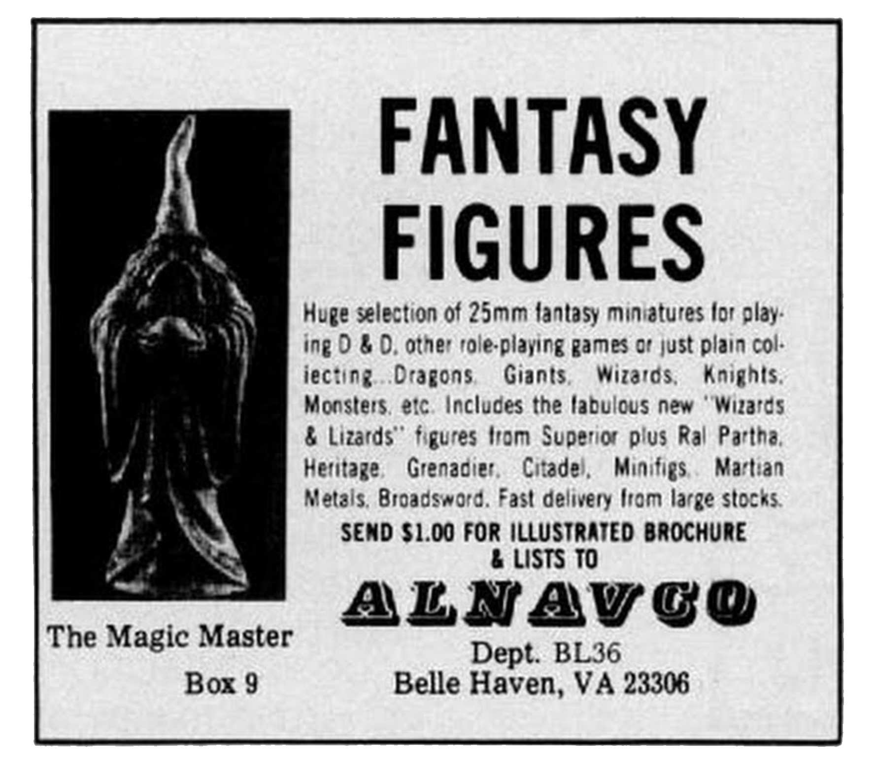 This one’s an oddity. Advertised in Boys’ Life magazine in 1982, this small block offers up metal miniatures for use with fantasy roleplaying games. The ad is clearly for a retailer of some sort, but the name “Alnavco” doesn’t ring any bells at all.