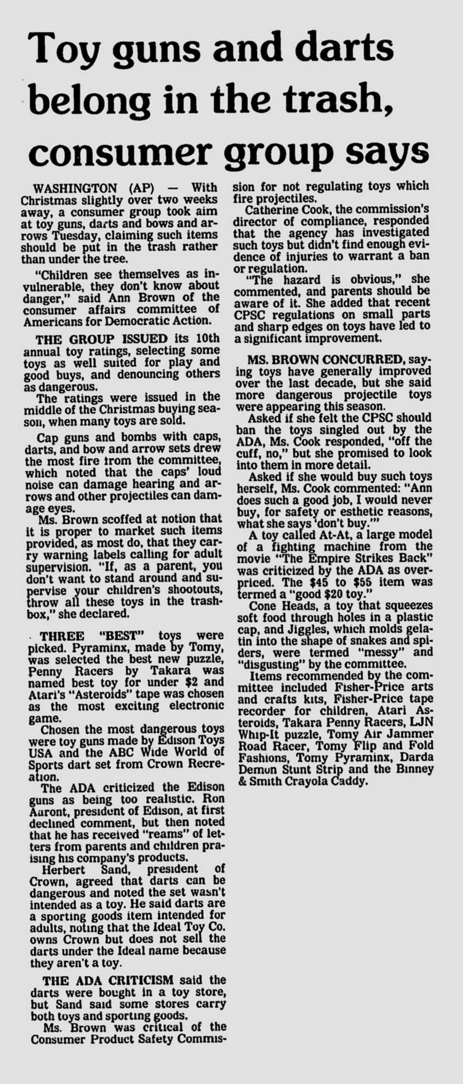 “A toy called At-At, a large model of a fighting machine from the movie ‘The Empire Strikes Back’ was criticized by the ADA as overpriced. The $45 to $55 item was termed a ‘good $20 toy.'”