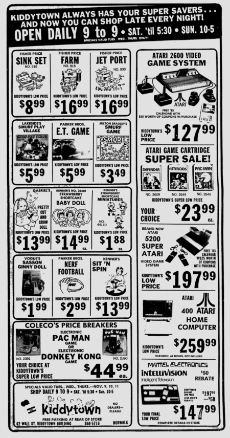 Defender. Asteroids. Pac-Man. Each is only $23.99 in this 1982 Kiddytown newspaper advertisement from 1982. Wait a moment. $23.99 sounds like a good price, but that’s the equivalent of $60.49 in 2017 dollars. Man, no wonder I never had an Atari system when I was a kid!