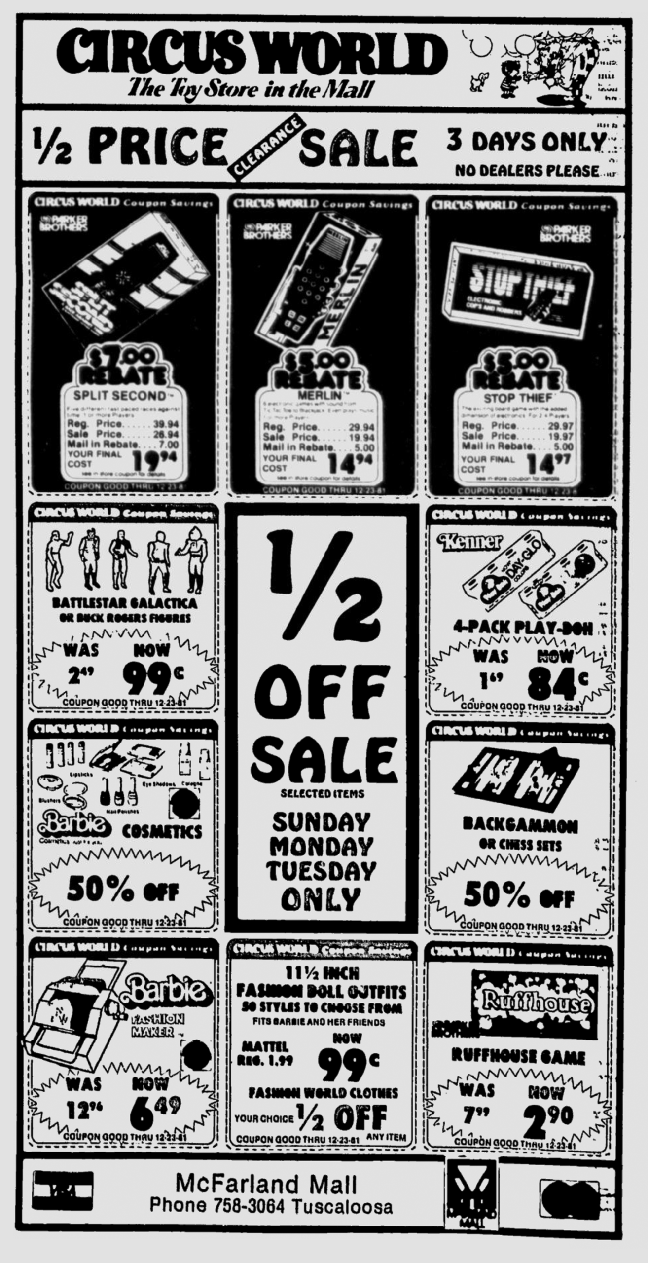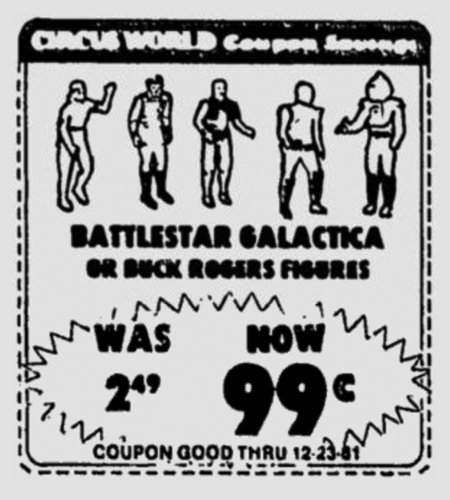 This is not the first time that we have seen the Battlestar Galactica and Buck Rogers lines advertised together (see this 1979 ad), but today’s Circus World newspaper ad comes from the end of both lines’ life at retail, as Star Wars slowed a little and demand for space action figures dropped enough that the lesser toylines started fading away. Battlestar Galactica and Buck Rogers priced at less than a buck for each? I’ll take them all!