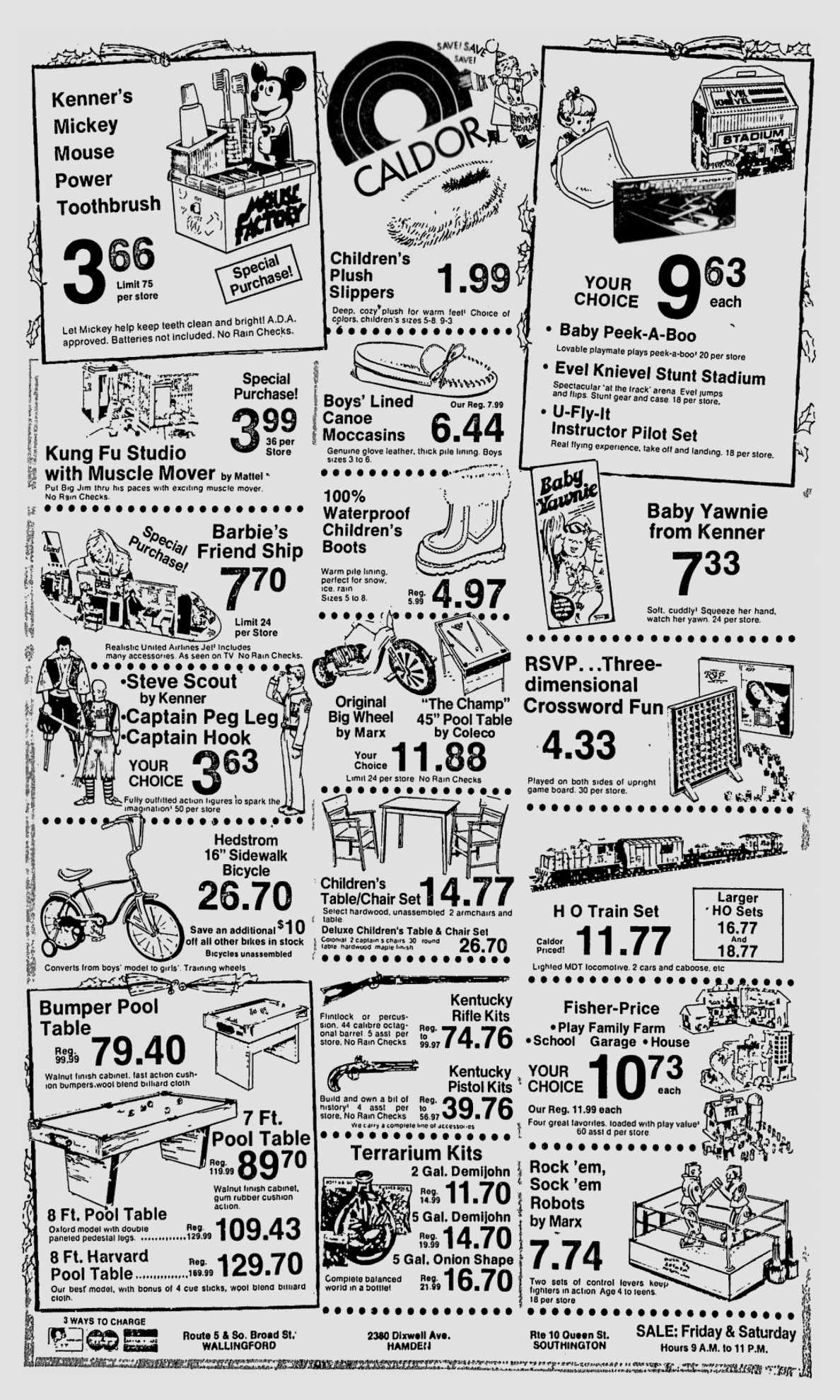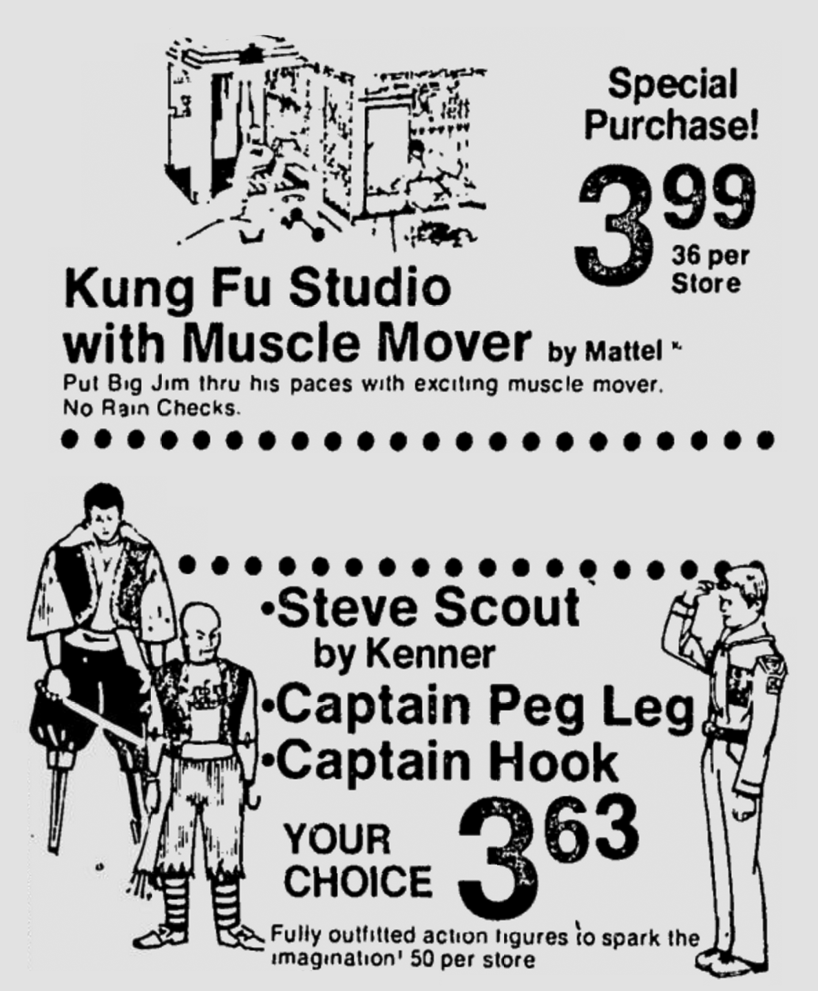 This 1974 Caldor newspaper advertisement is loaded with action figure fun for those of you who like things a little off the beaten path. The Big Jim Kung Fu Studio playset and case may be the star of the ad, but those Matchbox Fighting Furies action figures alongside Kenner’s Steve Scout cannot be missed! I’d love to chase down the Fighting Furies “Pirate Ship Carrying Case,” but I almost need to take donations to make that happen since every single one I find is pricey. Is the Fighting Furies line that popular, or is it just that the series was on shelves for such a short time that there aren’t many of the toys out there?