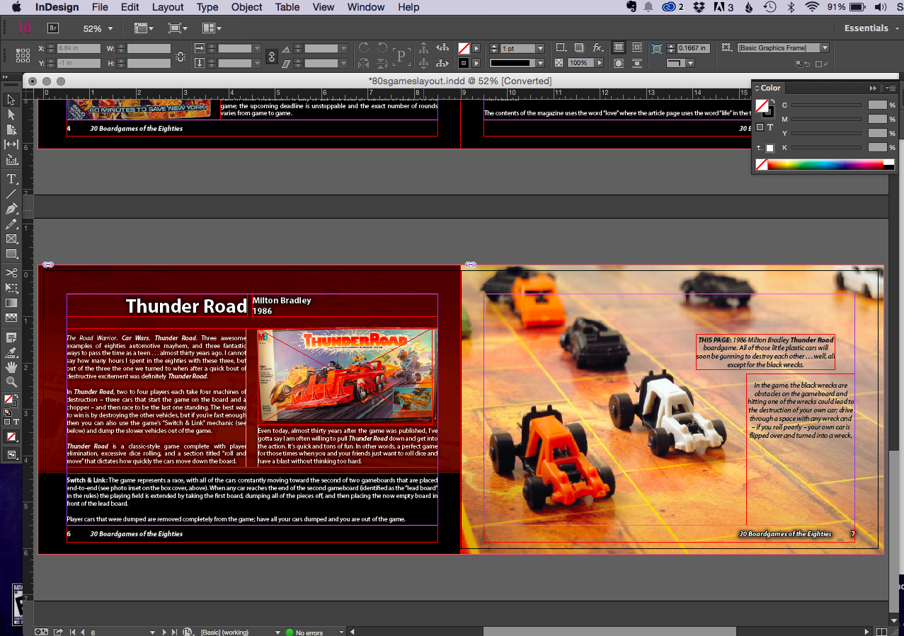 One idea that came up during the Action Figures Not Included project on Kickstarter was to create a book about eighties boardgames. Taking that idea and running with it just a little I shot test pics and assembled a few test pages; take a peek at this double-page spread featuring Thunder Road for a sneak at my first step at a book about boardgames. This in no way is final, but this is the direction I’ve been playing with.