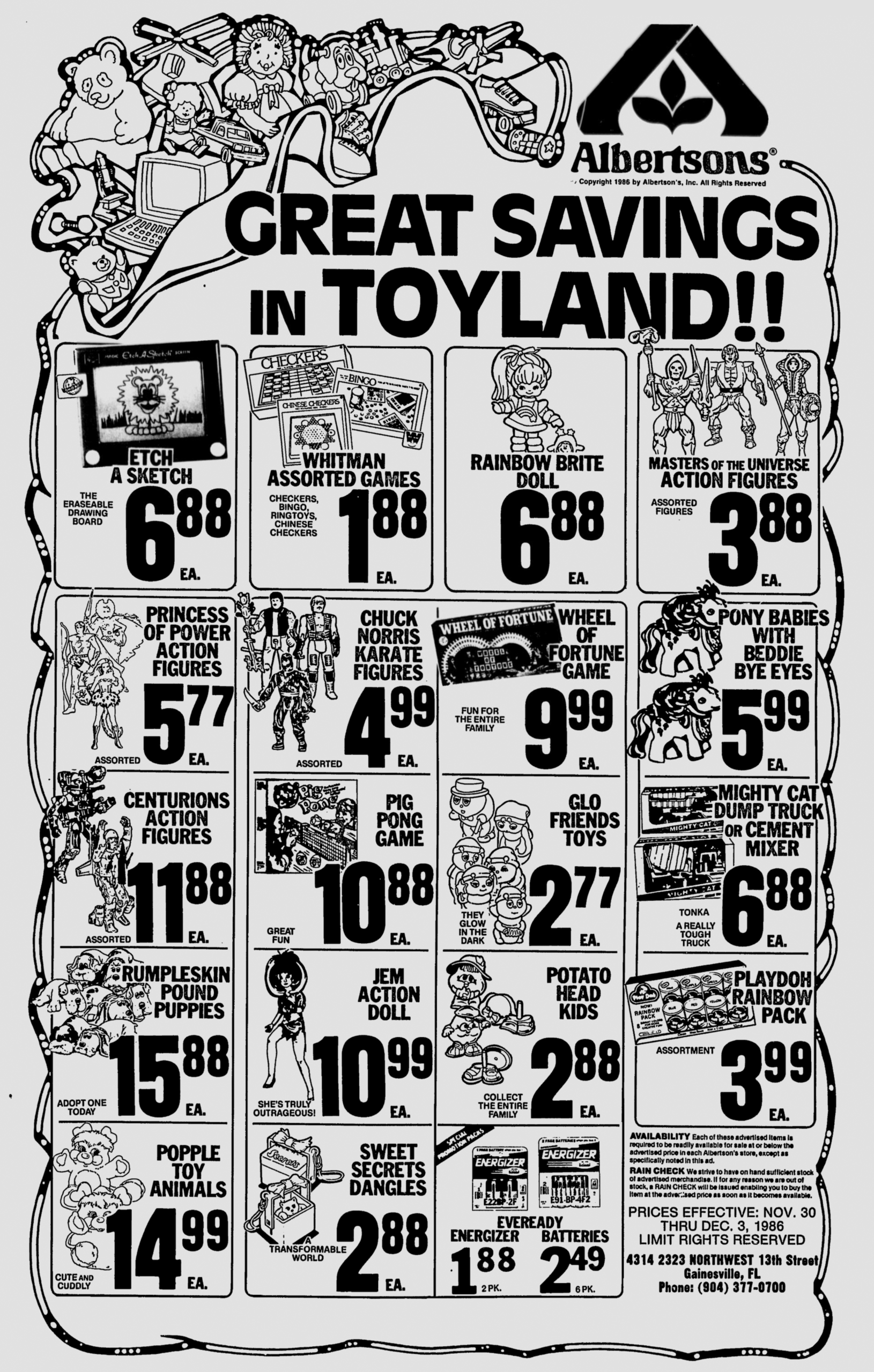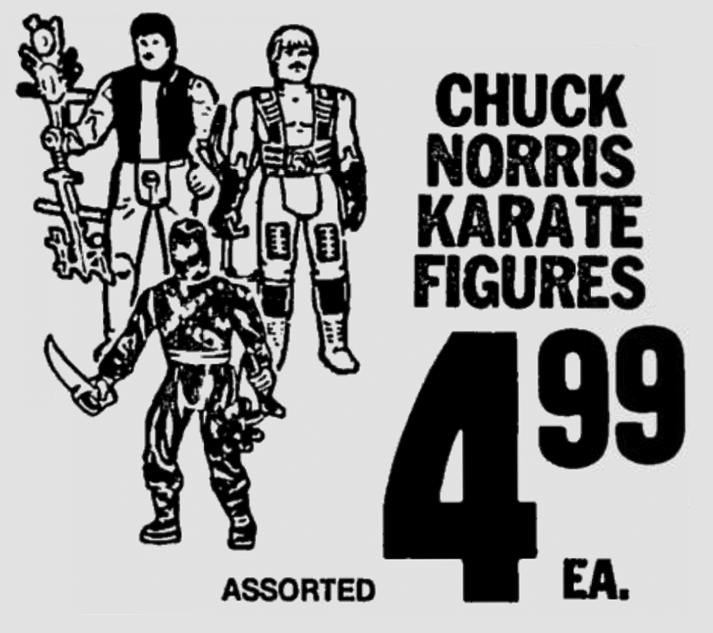 Kenner’s series of Chuck Norris Karate Kommandos action figures, created in support of the short-lived animated series, reached stores in 1986, and this Albertsons newspaper ad from that year shows us that kids were paying $5/figure if they wanted the toys. That price tag aligns nicely with some of the other Chuck Norris ads we’ve seen (here and here), and if I ever do sit down and create a book of Kenner’s action figure lines, you can be certain that Chuck Norris will get a section all his own.