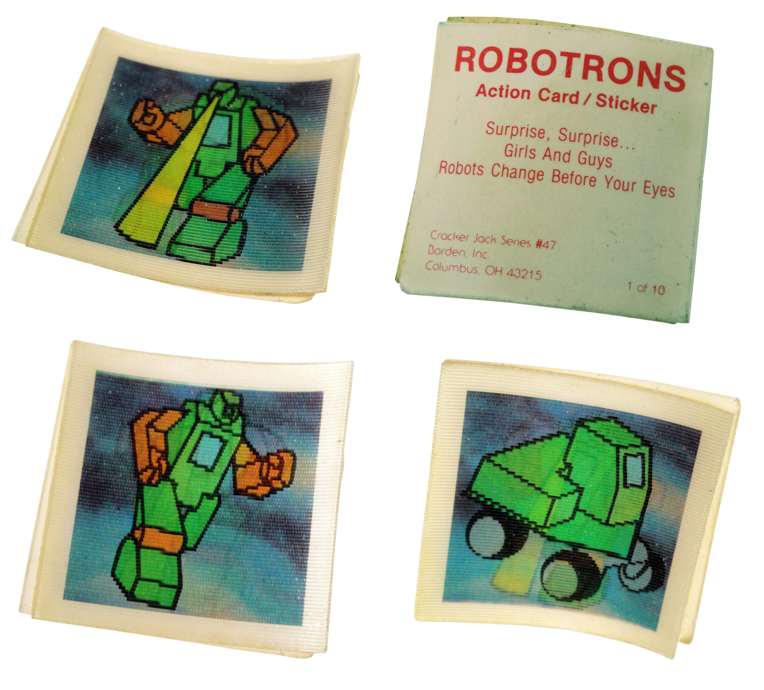 What we need to find is detailed information on the Cracker Jack Robotrons sticker set from the eighties. I now own four of the ten stickers, but what I don’t have is release information or any idea if the packaging made it clear that these Robotrons stickers were inside the box.