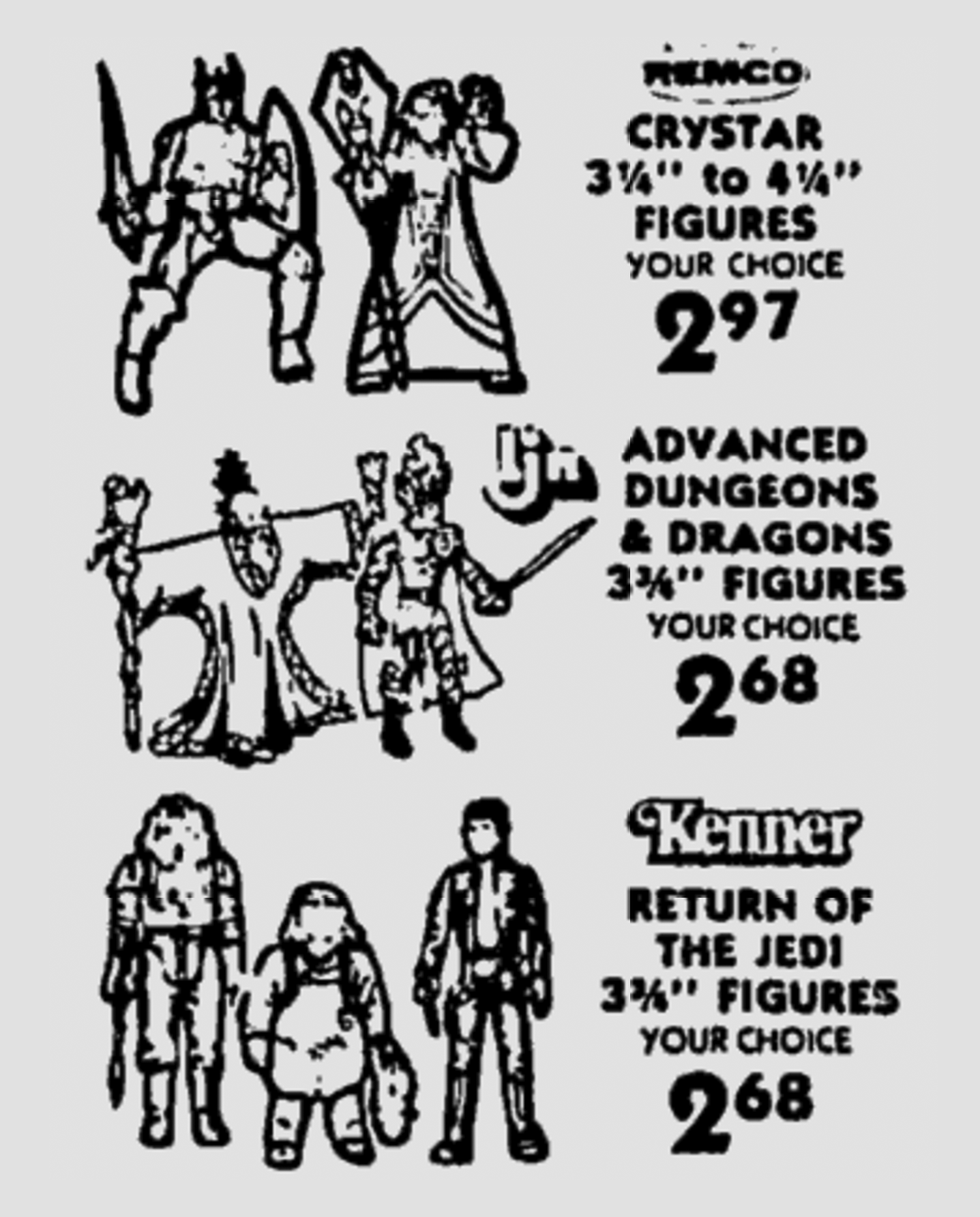 Two Crystar newspaper ads in one day? (See this post.) Crazy! But that’s exactly what is happening right now, and this 1983 ToysRUs ad brings us more than just Crystar as both LJN’s Dungeons & Dragons and Kenner’s Star Wars action figures join in on the fun.