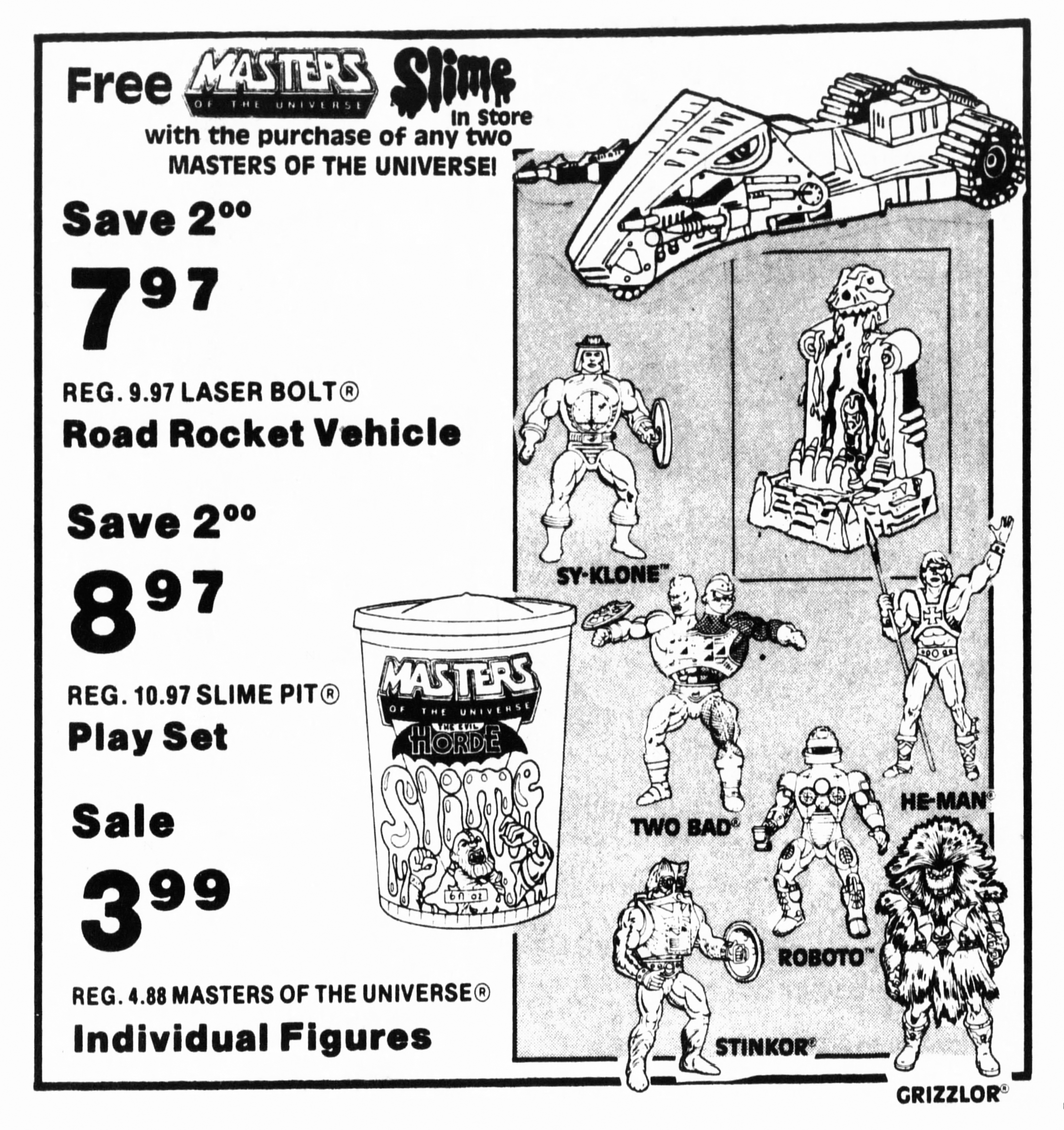 That M.U.S.C.L.E. advertisement we saw a few days ago also included this block for Masters of the Universe toys, specifically an offer to receive a free can of slime with the purchase of two Masters of the Universe action figures. Kids love nasty stuff, so what child of 1986 could resist a chance at free slime?
