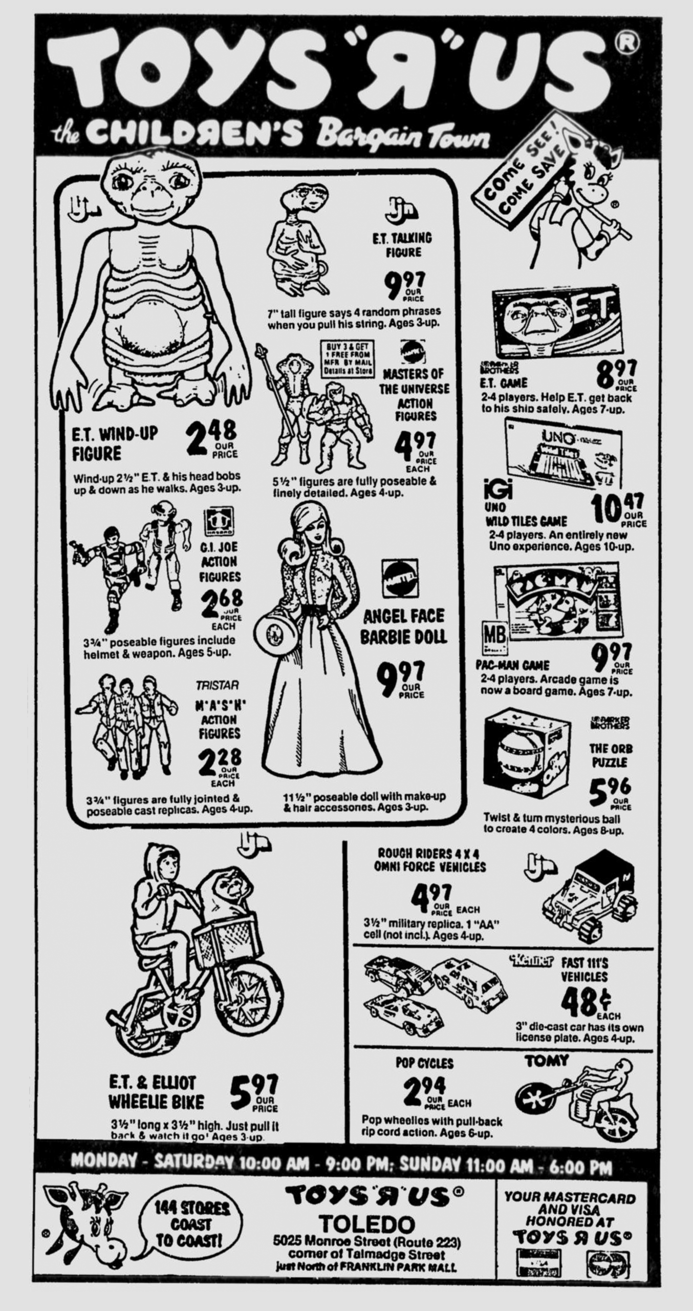 In a newspaper ad packed with E.T. merch we find this small block for Hasbro’s G.I. Joe action figures. This is from early in the G.I. Joe run in the eighties, so I am not sure if the brand was a hit at this point or not. I’ll know more next week; I’m set to visit the Strong Museum where I’ll be seeking out sales data and retailer anecdotes on the G.I. Joe toys of the eighties. Wish me luck!