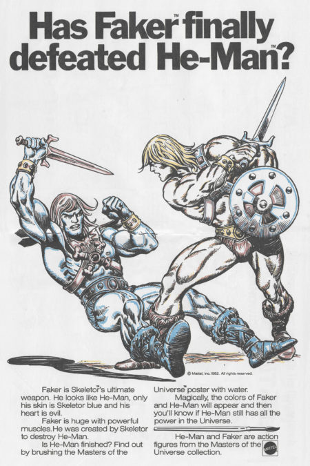 This two-page spread from a 1983 issue of Muppet Magazine is effectively a paint-by-number poster that was designed for kids to paint the image with water and reveal the colors. The advertisement poses a question that is answered only when you add water . . . or when you stop and take a look at the faint colors of the ad. “Has Faker finally defeated He-Man?” Well, the word finally is a bit much, but we can say that He-Man defeats Faker in this advertisement.