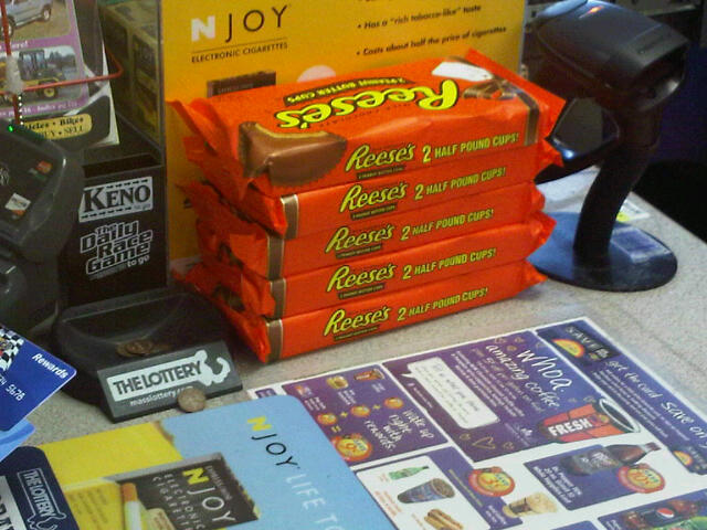 I’m out for a walk and while grabbing a drink at a gas station I spotted these insanely massive Reese’s Cups. I love my peanut butter cups, but half-pound cups is just ridiculous. What am I supposed to do, slice these as if they were pies?