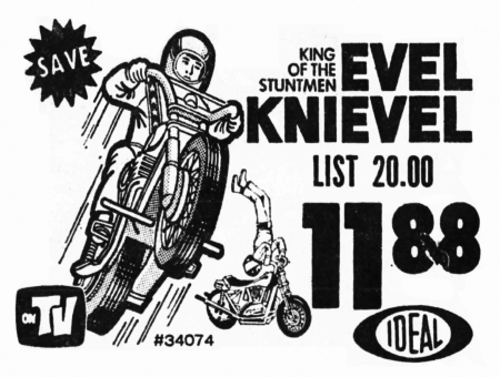 February 4, 1975. Does it get any more seventies than this ad block for Ideal’s Evel Knievel motorcycle toy? Despite not even owning the toy when I was a kid, this Los Angeles Times newspaper ad for the Ideal toy on clearance still triggers memories; trust me when I say that all kids my age wanted their own Evel Knievel motorcycle toy back in the late seventies.