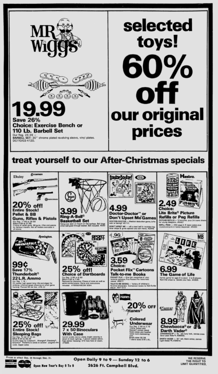 This 1978 Mr. Wiggs newspaper ad shows off one of the rarer of the Kenner Star Wars toys of the late seventies, the large-scale action figures! I had the standard size figures when I was a kid, but the price of this larger action figures meant that I never owned any of them. Kinda sad now that I think about it, because it would have been much easier to collect all of the figures in this size than it was to try and collect the 3.75-inch scale Star Wars action figures. What’s worse? I still don’t have any of these toys!