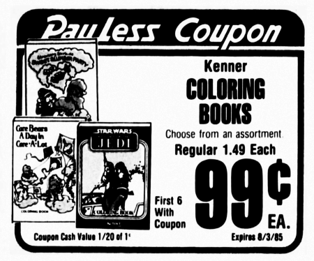 July 28, 1985. Two years after the release of Return of the Jedi, we find this ad block for Return of the Jedi coloring books on sale in the Santa Cruz Sentinel newspaper. I suspect that the demand for Star Wars coloring books was near-zero by this time, though I can admit that I’d buy multiples at less than a buck apiece. And as for the Care Bears and Strawberry Shortcake coloring books also on sale in this ad? Yep. I’d also buy those! Clear a path, gang, I’m in search of inexpensive coloring books this morning.