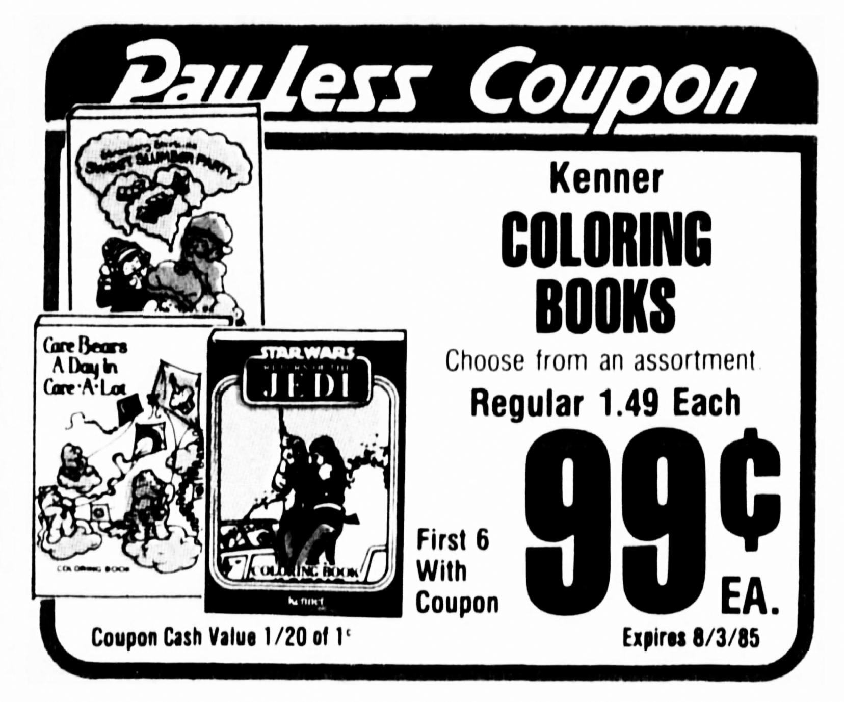 July 28, 1985. Two years after the release of Return of the Jedi, we find this ad block for Return of the Jedi coloring books on sale in the Santa Cruz Sentinel newspaper. I suspect that the demand for Star Wars coloring books was near-zero by this time, though I can admit that I’d buy multiples at less than a buck apiece. And as for the Care Bears and Strawberry Shortcake coloring books also on sale in this ad? Yep. I’d also buy those! Clear a path, gang, I’m in search of inexpensive coloring books this morning.