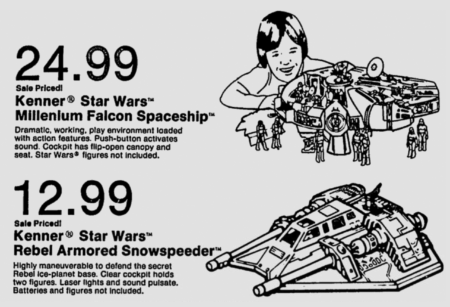 That Buck Rogers ad that we saw a few days ago also included this ad block for Kenner’s Star Wars Millennium Falcon and Rebel Armored Snowspeeder vehicles and left me with a question: Why are there so many newspaper ads where we see both vehicles together? Was it that retailers ordered both in high quantities at the same time, or did Kenner offer up some sort of special deal and a savings when buying the two together? Damn, I really need to track down some of the Kenner sales kits from the late seventies and early eighties!