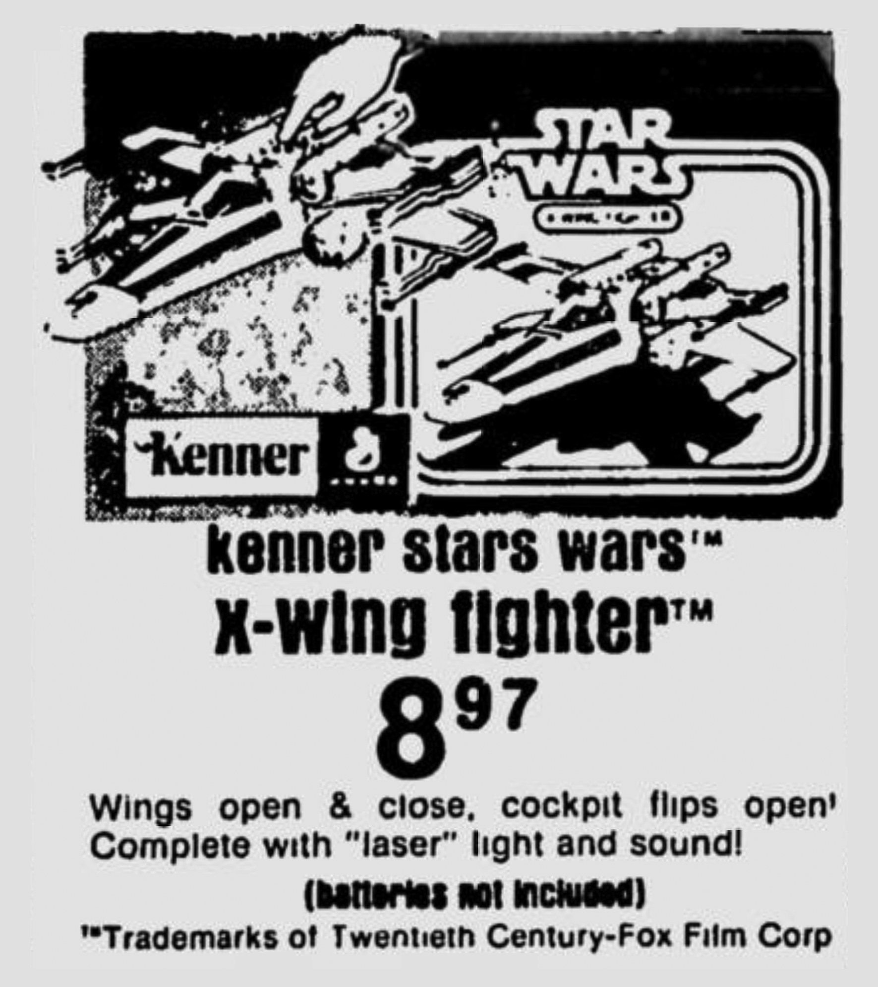 If you turn to p. 36 in my book of Star Wars newspaper ads, Collect These Figures and Accessories*, you’ll find the ad-mate to this X-Wing ad block from King’s in 1979. It turns out that even though I captured and shared the Darth Vader TIE Fighter portion of this advertisement, I neglected to direct your attention to the X-Wing Sorry about that!