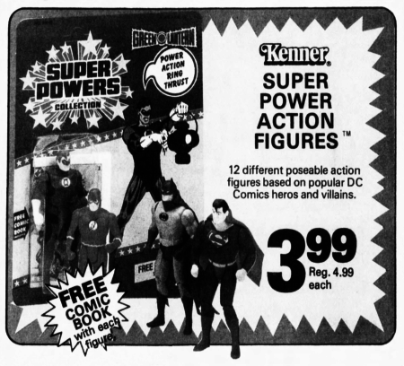 The $4.28 price we saw in a 1984 ad a few days ago wasn’t the best price you could find for Kenner’s Super Powers action figures in September of 1984. This September 30 ad from the Louisville, Kentucky, Courier Journal newspaper shows the toys on sale for only $3.99/each at the SuperX drug stores, meaning that I know where to take my $5 bill if I’m ever in Louisville in September of 1984.
