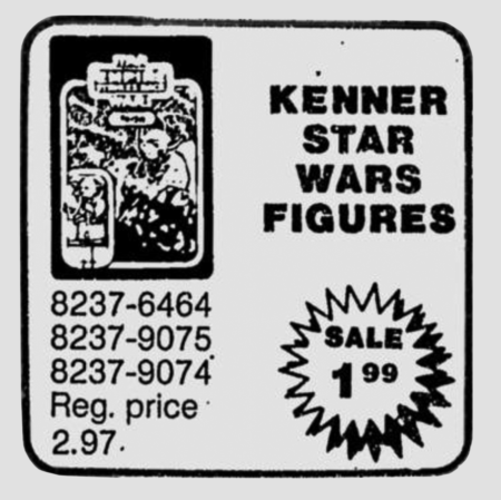 Last week’s Hot Wheels newspaper ad also included a treat for the fans of Kenner’s Star Wars action figures: This grainy ad block showing Yoda and the toys priced at only $1.99/each! This is far from the lowest price we’ve uncovered for the toys, but there’s still a sense of excitement each time I happen across the toys on sale back in the eighties.