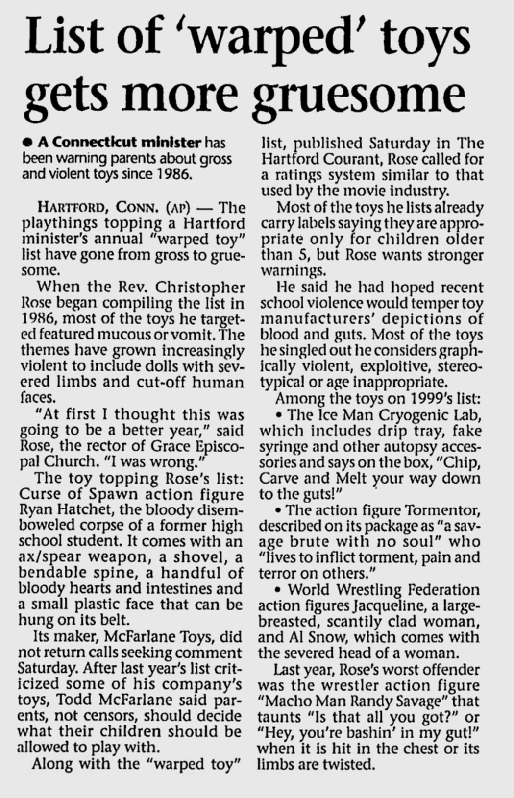 “List of ‘warped’ toys gets more gruesome” in 1999