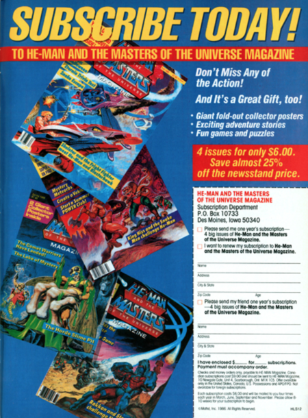 Here’s something you’re unlikely to see in today’s competitive toy market: Mattel’s Masters of the Universe advertised in Hasbro’s G.I. Joe magazine! These days, getting Mattel and Hasbro to agree to any sort of promotion that potentially helps the other company would be a miracle, but it appears that the two were far more likely to play nice together back in the eighties. Seeing this now makes me wonder if the Masters of the Universe magazine ever included an ad for the G.I. Joe magazine.