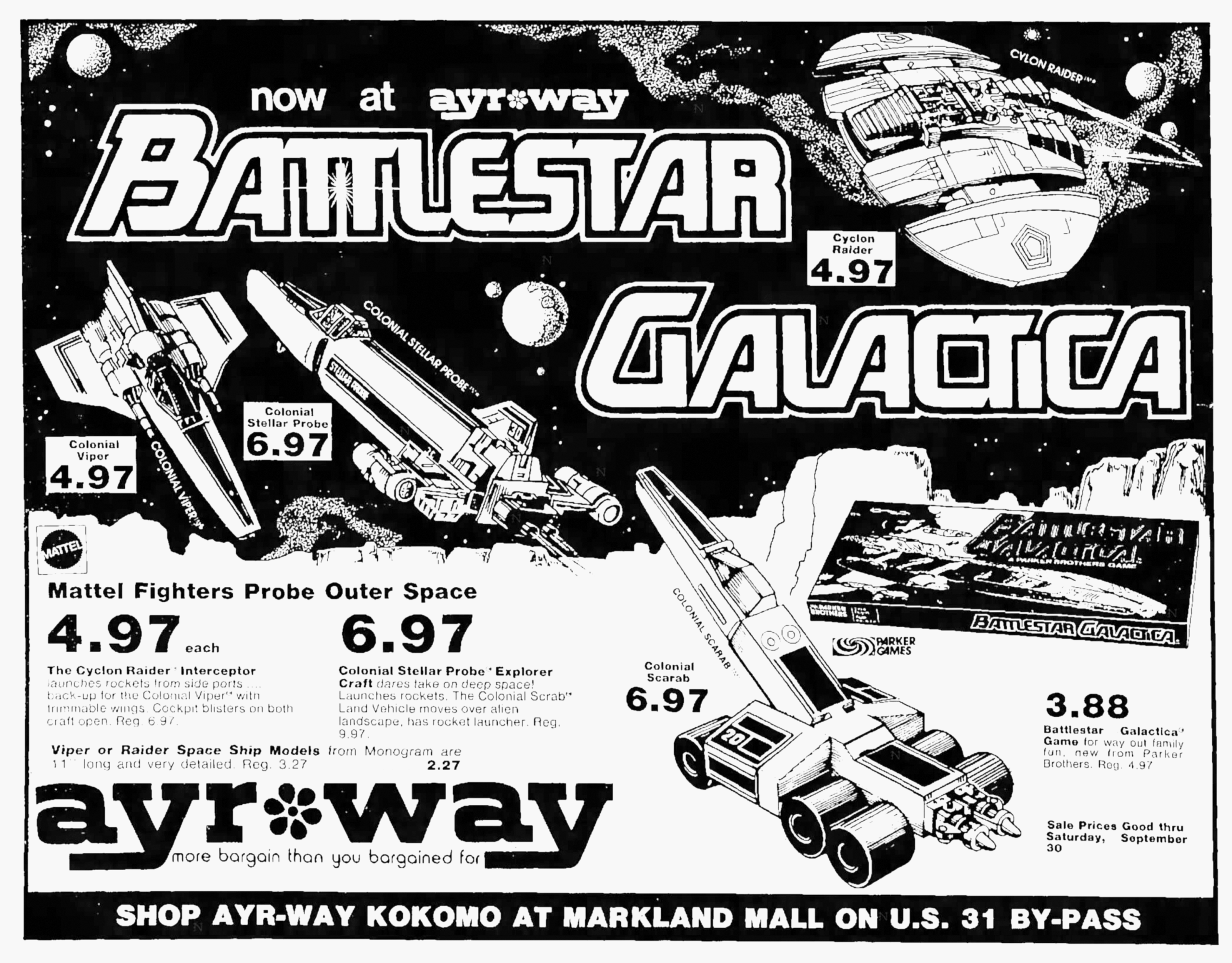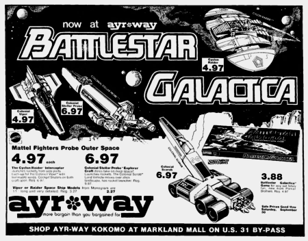 The Kokomo, Indiana, Kokomo Tribune newspaper issue of September 24, 1978, offers up this fabulous advertisement for the Mattel Battlestar Galactica toys, giving us one of our earliest looks at the Colonial Viper, Colonial Stellar Probe, Cylon Raider, and Colonial Scarab toys. The addition of Monogram Battlestar Galactica model kits and the Parker Brothers boardgame make this ad one that deserves to be documented and enjoyed, right?