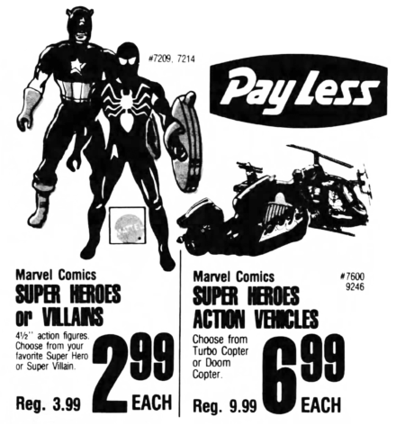 The recent Wheeled Warriors ad and Tomy Tribots ad, if those two toys were all that were presented, would have been an incredible find all alone . . . so imagine how very exciting it was to also spot these Mattel Secret Wars toys on sale in the same newspaper ad! I know the Secret Wars line isn’t anywhere near as popular as Kenner’s Super Powers Collection from the same time, but you’ve gotta admit that it’s fun to see these Secret Wars action figures and vehicles offered up for sale in 1985.