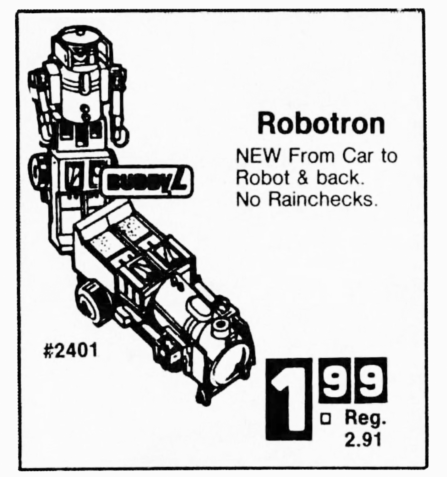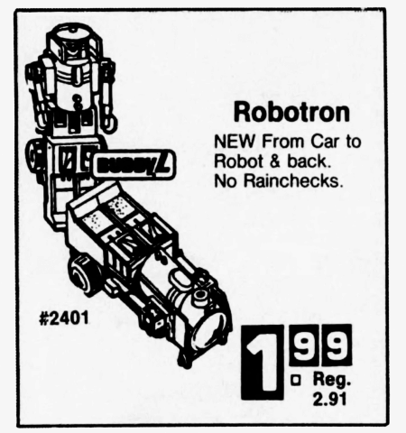 September 19, 1984. The start of the cheap transforming robot toy flood of the 1984 holiday season starts right now! This newspaper advertisement from the Vernal, Utah, Vernal Express newspaper brings us the Buddy L Robotron toys for only $1.99/each, showing exactly why so many of these were given out for Christmas that year. $2? Sold!!!