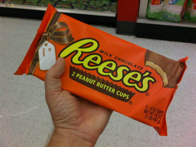 When I was in Boston recently I encountered giant Reese’s peanut butter cups (photo here) but as was pointed out to me the photo didn’t properly show scale. Well, today at Target I again found the half-pound cups . . . and here’s a new pic!