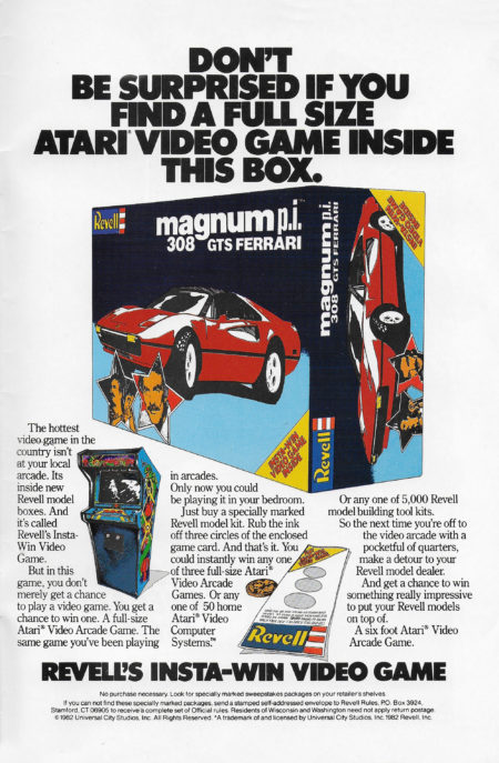 Revell models in 1982, as this old comic ad shows us, offered a chance at winning an Atari arcade game, and not just a cartridge! The company was giving away three full-size arcade cabinets and entering was as easy as buying a Revell model kit and scratching off “three circles of the enclosed game card.” Unfortunately, even if you happen to find one of these marked kits today, the contest is long over.