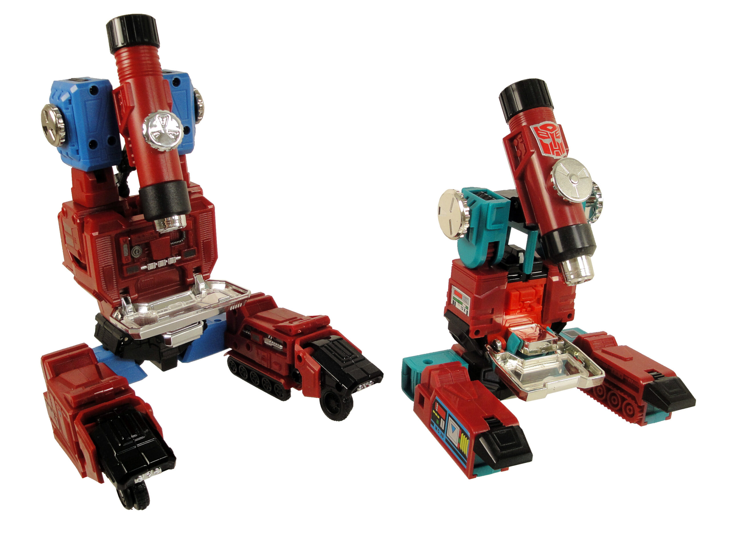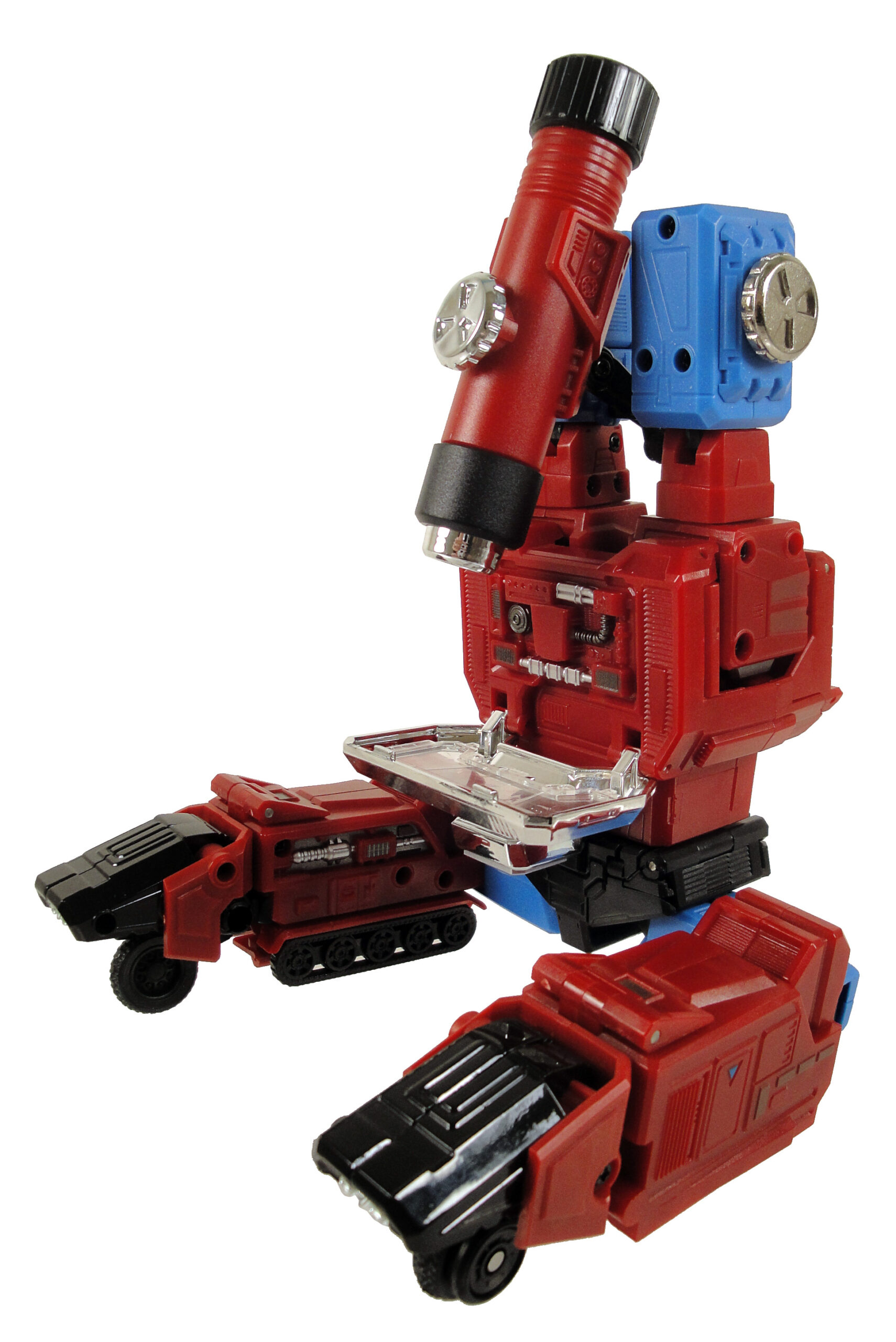 FansToys’ Tesla* starts off strong with the appropriate alt mode and looks great as a microscope. The above photo shows the toy alongside the Transformers Collection Perceptor re-release toy (review here), and even though a microscope is a dull alt mode FansToys made this work well. Even better is that the toy — like the original version from 1985 — is a working (low-powered, yes) microscope. Hurray for silly features brought into the future!