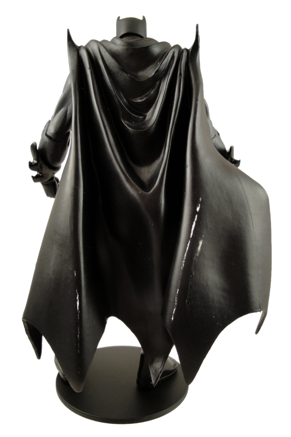 The real problem, though, isn’t even a painted detail: Look at the photo, above, and you can see white streaks across the back of the cape where there paint is just missing. What should have been an attractive design was ruined from behind by, I suspect, packaging the toy too soon. I tried rubbing off the white but that’s just not gonna happen. Fortunately it’s not at all noticeable when Batman is displayed on the shelf . . . I don’t know about you, but my toys face the room and not the wall.
