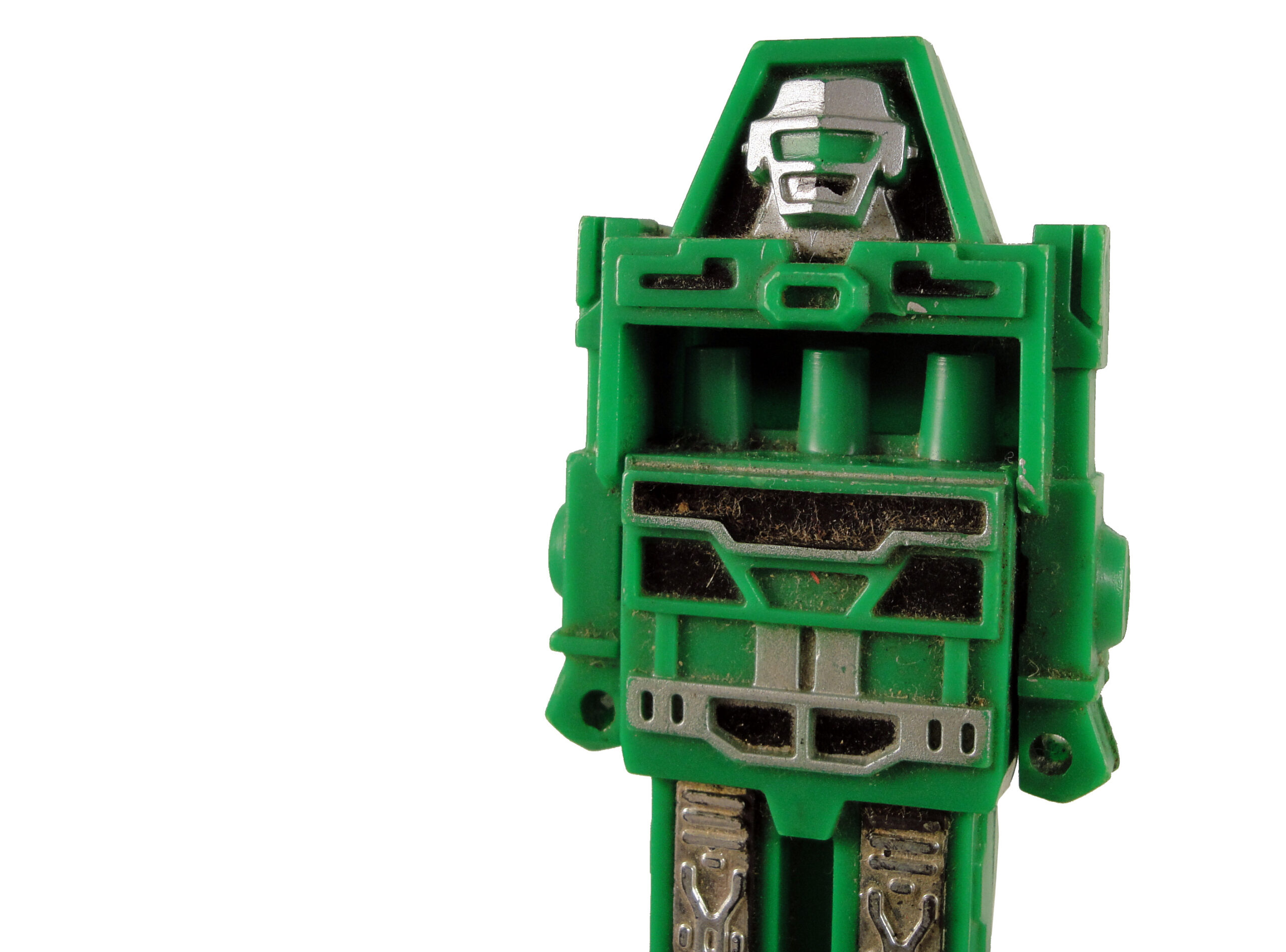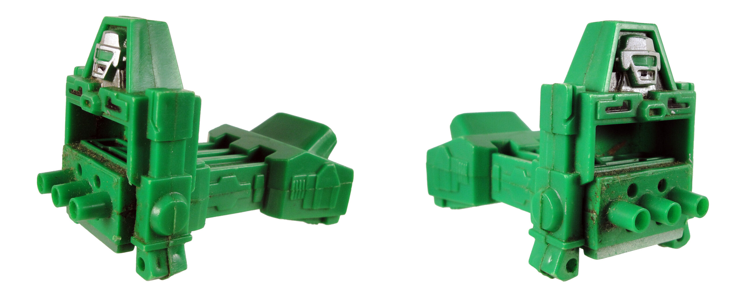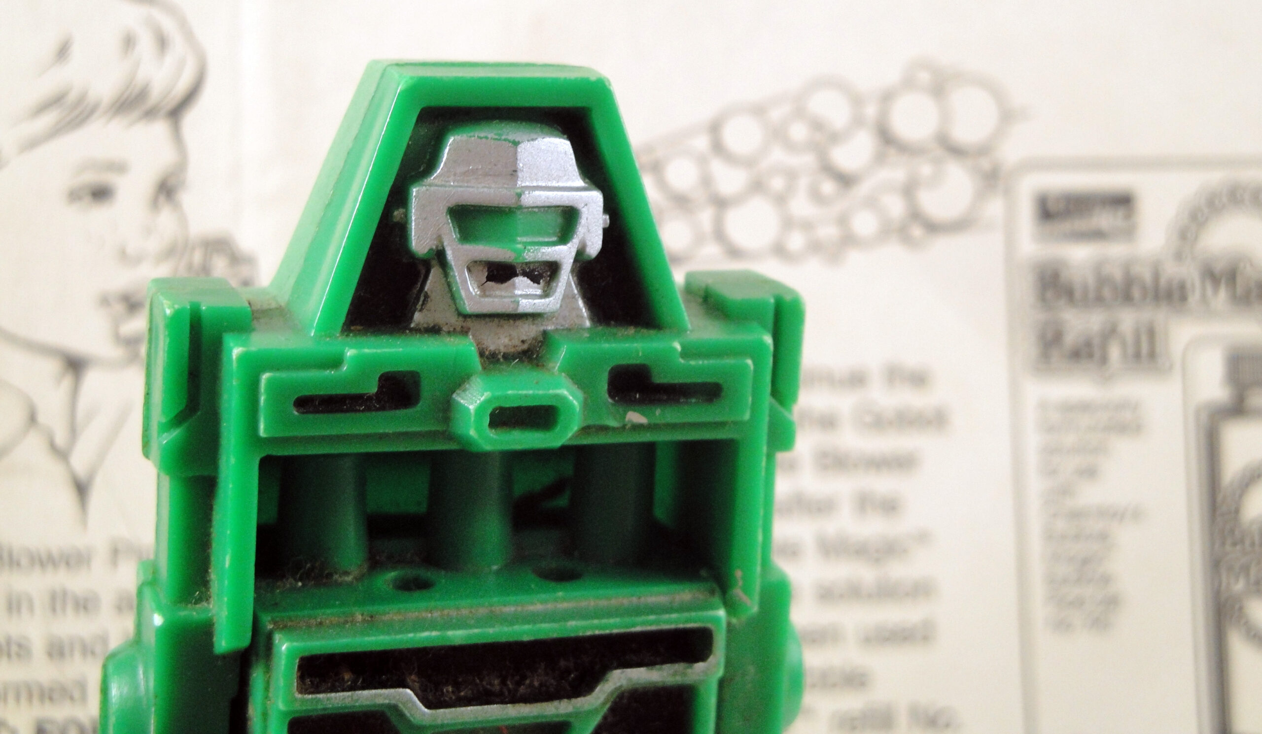 You’ve probably noticed that the packaged robot is blue while all of the other shots are of a green robot. Tootsie Toy, manufacturer of the GoBots Bubble Man toy, released this in a variety of colors and I managed to find a loose one and a packaged one. I thought it might be fun to snap pics of the green robot exactly as it reached me: filthy from three decades of exposure to the world. I’ve now washed off the toy and will let it dry. I’ll probably have to attack it with a brush to really clean the decades of grime off of the plastic.