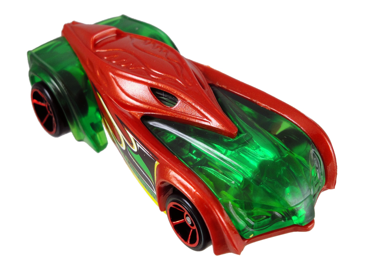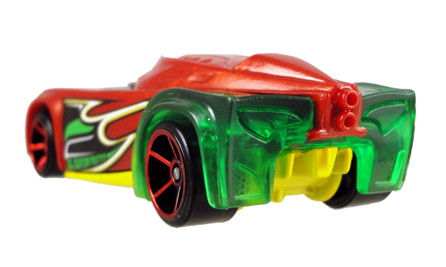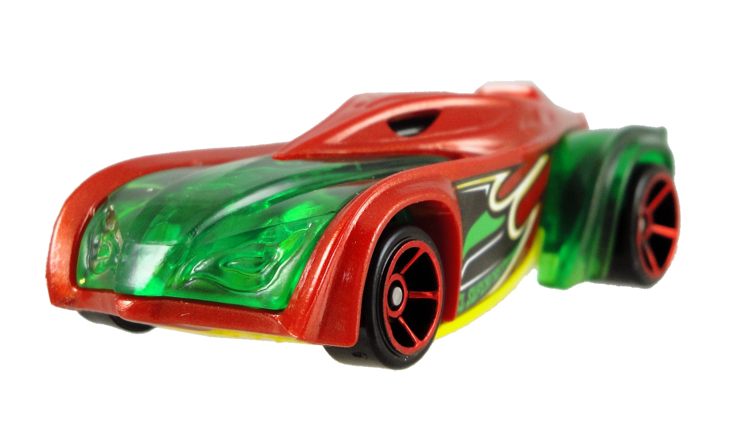Sure it almost has a Christmas-feel, but that translucent green body wrapped by a red plastic shell gives the car a great look. While I was looking over the car I showed it to Gina and pointed out how the green plastic went under the red so after a few moments with the car she had the red popped off and showed me how the two pieces separated. I never would have taken that risk, but she did and the car comes apart and goes back together very easily.