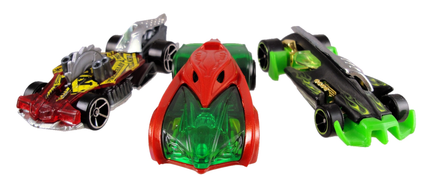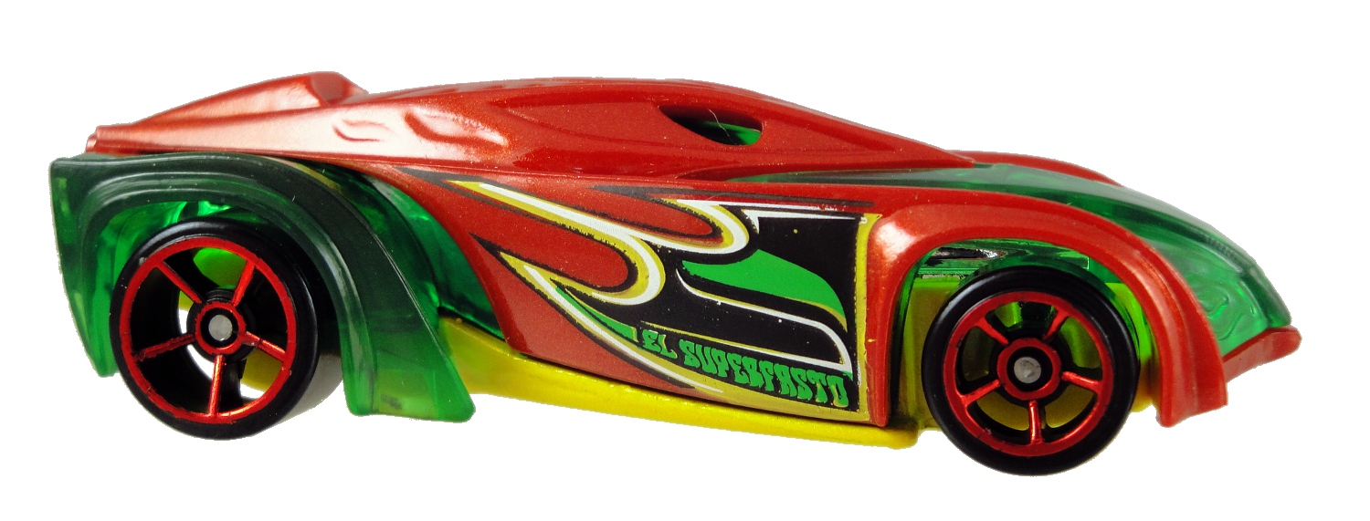 Now here is one amazingly hot Hot Wheels car. The El Superfasto (Hot Wheels wiki), one of the newer releases in the line, may have a lot of plastic but the effect is impressive and couldn’t have been pulled off with metal. What we’ve got here is a slick, mean car with a metal chassis, translucent green plastic body, and a red plastic shell that snaps on over the green body. Did I mention that this is a cool car design?