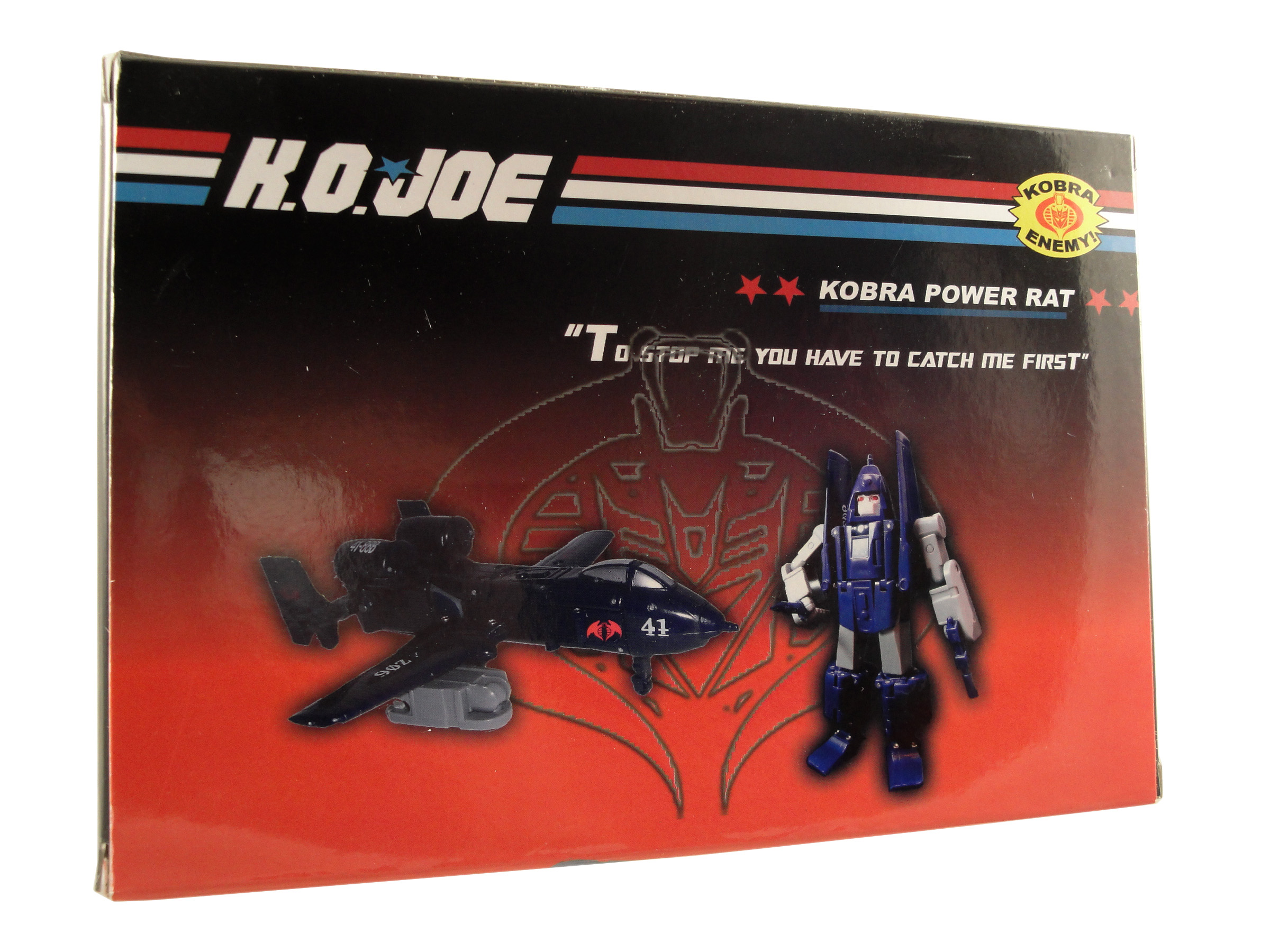 Marked as the K.O. Joe Kobra Power Rat the box is great, following the design lead of the G.I. Joe toys of the eighties while clearly an homage and not an attempt at passing itself off as an official toy. Actually, looking at this box reminds me of the packaging for HeadRobots’ Cobra Blue Soldier “Snake” (review here), which was another unofficial Transformers toy with a G.I. Joe-inspired colorway. My only complaint with the box is how scuffed and dirty it is; opening the outer package from KOToys I was a bit unhappy to see that they had crammed everything into one box (even going so far as bending the card of one toy). Fortunately, though, the toy was unharmed in shipping.