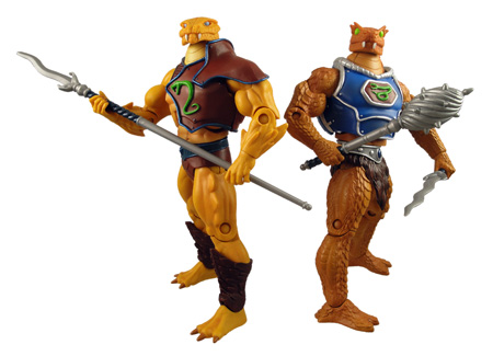 One of the ways in which Mattel has managed to produce the Masters of the Universe Classics series as an online exclusive — selling fewer toys than if these were in stores — is by reusing and mix-n-matching parts across the line, and the Snake Men are an example of when that parts reuse works wonderfully. As both The Fwoosh review and the review at It’s All True point out, the reuse is from multiple figures . . . not really surprising since we’ve got two different-looking Snake Men action figures in a single pack.